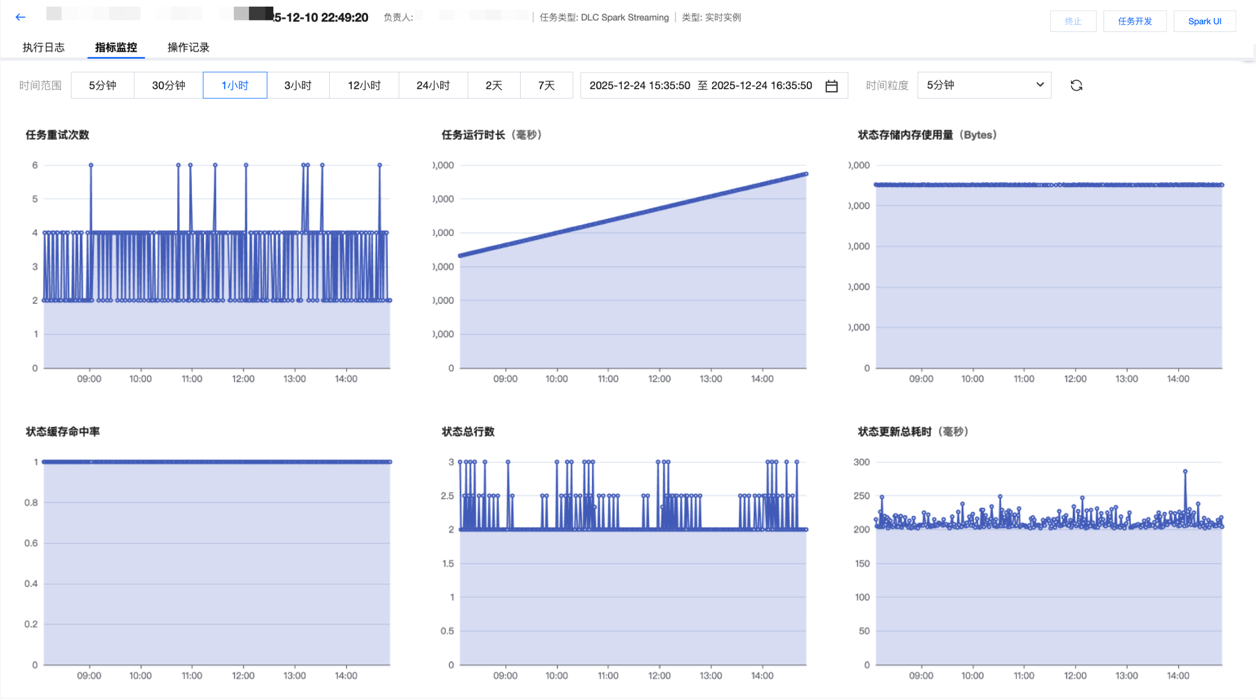 指标监控 | 指标监控支持查看 DLC Spark Streaming 实例运行时的关键指标,关键指标包括:Driver 内存百分比、每秒输入的记录数、每秒输出的记录数、数据流入延迟处理时间、任务背压比例、任务重试次数、任务运行时长、状态存储内存使用量、状态缓存命中率、状态总行数、状态更新总耗时、状态提交总耗时。 支持按预设的时间范围筛选,也支持自定义时间范围筛选。预设时间范围包括:5分钟、30分钟、1小时、3小时、12小时、24小时、2天、7天;自定义时间范围支持选择近30天。 指标监控时间粒度支持按5分钟、1分钟间隔展示。 ![]() |