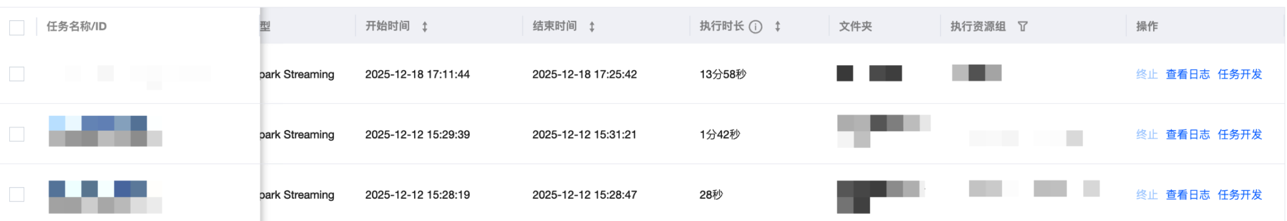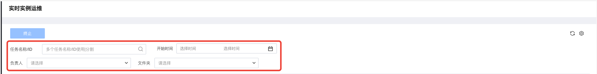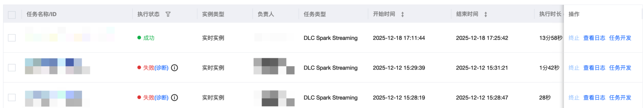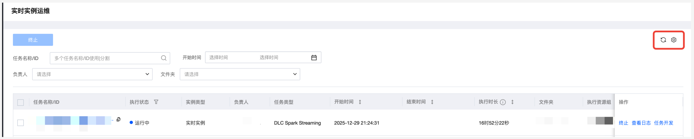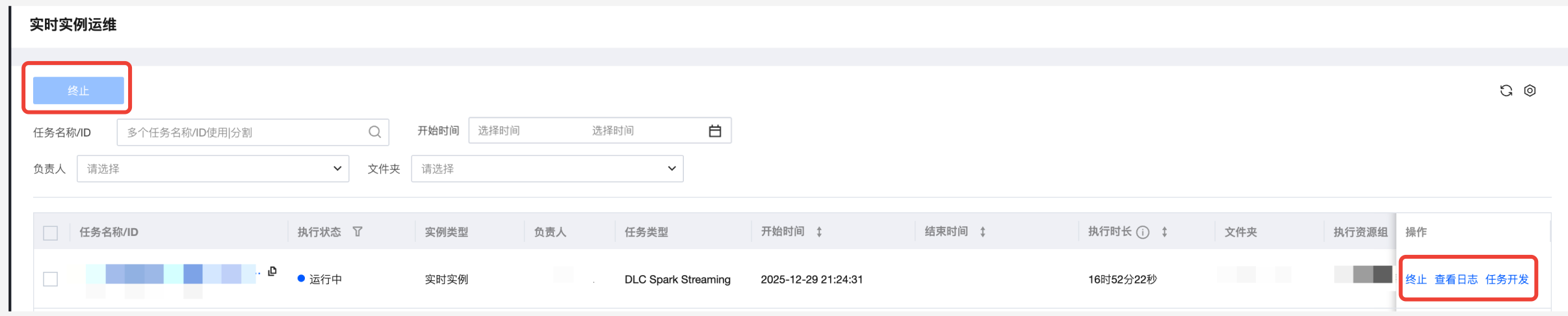 终止 | 分为批量操作和单任务操作,批量操作在任务名称前进行勾选,再使用上方的功能按钮;单任务操作点击任务列表操作列的操作项。 仅对实时实例为“运行中”的实例可操作,终止实例后,对应实例会被终止运行,执行状态会置为“失败”。 |