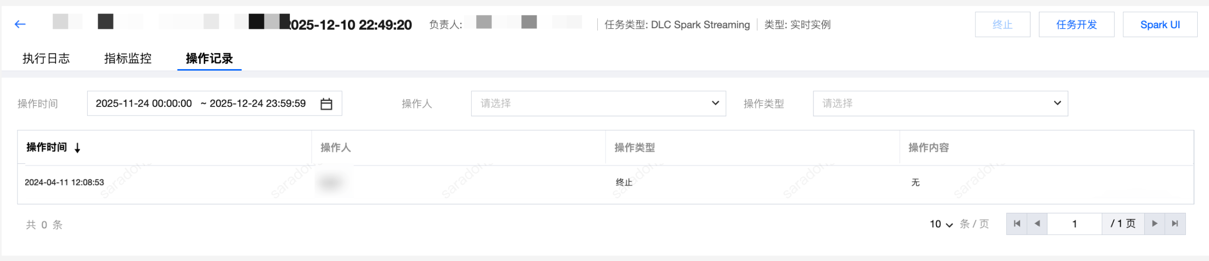操作记录 | 查看对实时实例的操作记录,包含终止操作的操作人、操作时间等信息。 ![]() |