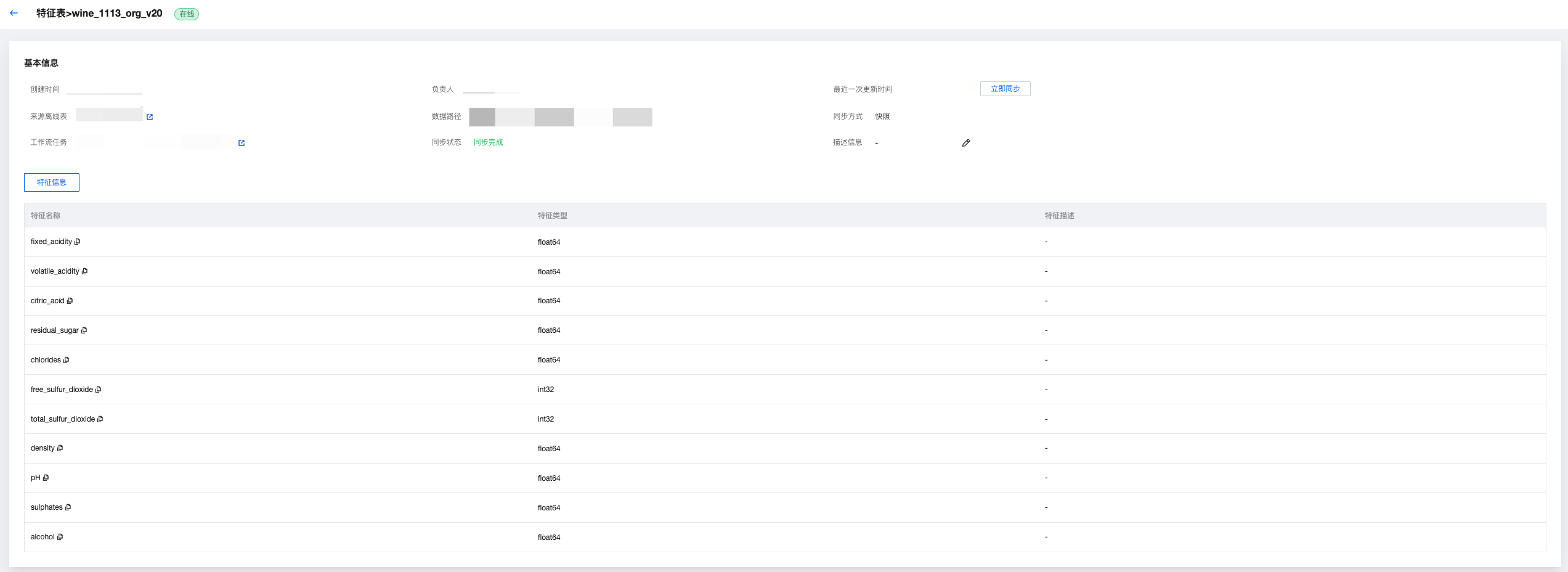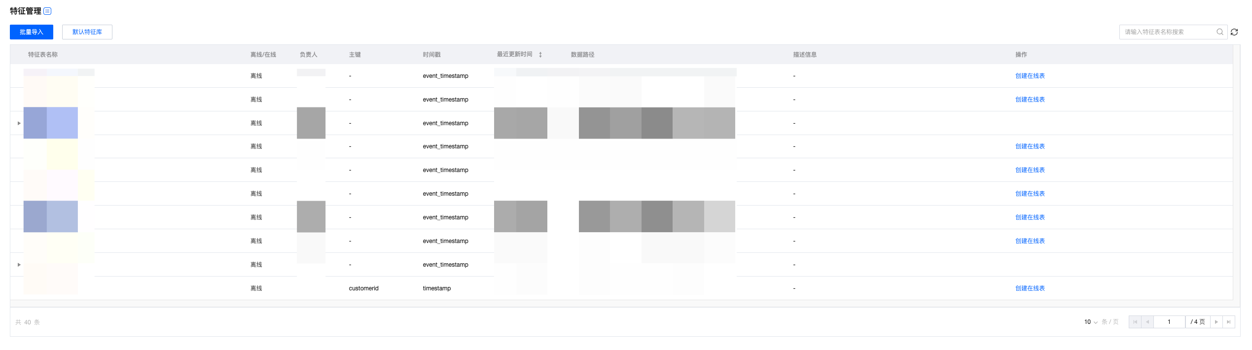 界面操作功能 | 1. 支持查看特征表的基础信息、特征字段信息等; 2. 支持批量导入特征表; 3. 支持创建特征同步等。 |