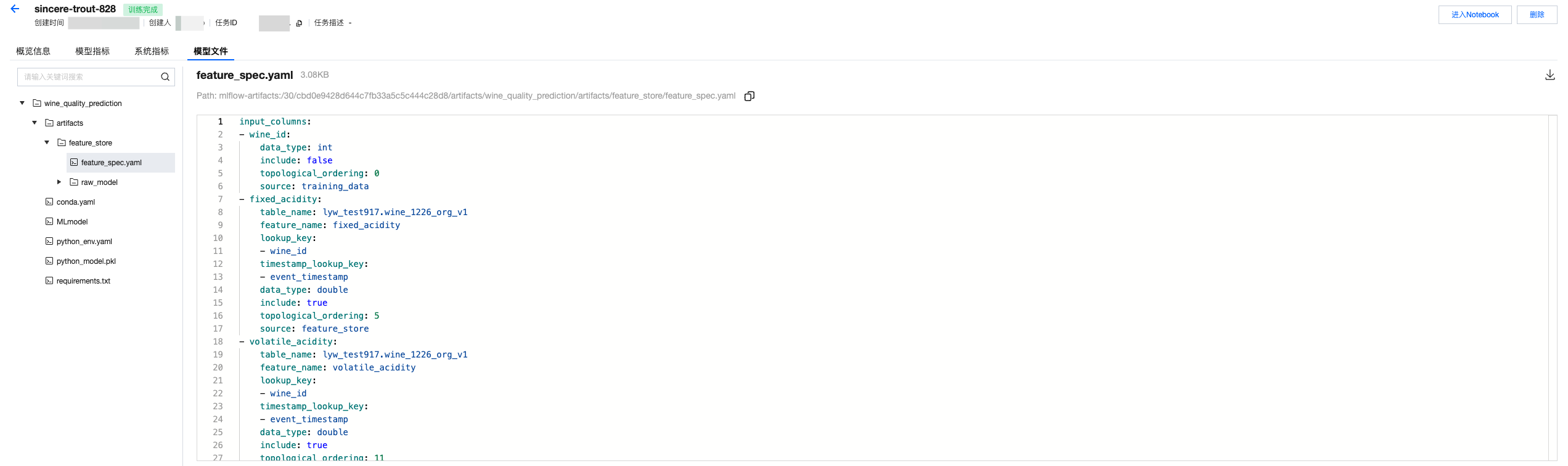 from wedata.feature_store.utils import env_utilsproject_id = env_utils.get_project_id()expirement_name = f"{table_name}_{project_id}"model_name = f"{table_name}_{project_id}"# 定义特征查找# Define feature lookupwine_feature_lookup = FeatureLookup(table_name=table_name,lookup_key="wine_id",timestamp_lookup_key="event_timestamp")# 构建训练数据# Construct train datainference_data_df = wine_df.select(f"wine_id", "quality", "event_timestamp")# 创建训练集# Construct trainsettraining_set = client.create_training_set(df=inference_data_df, # 基础数据dataframefeature_lookups=[wine_feature_lookup], # 特征查找配置set feature lookuplabel="quality", # 标签列lable columnexclude_columns=["wine_id", "event_timestamp"] # 排除不需要的列exclude columns)# 获取最终的训练DataFrame# Get final train DataFrametraining_df = training_set.load_df()# 打印训练集数据# print trainset dataprint(f"\\n=== 训练集数据 ===")training_df.show(10, True)