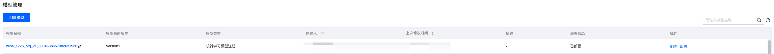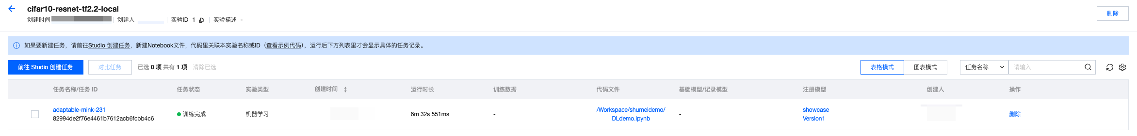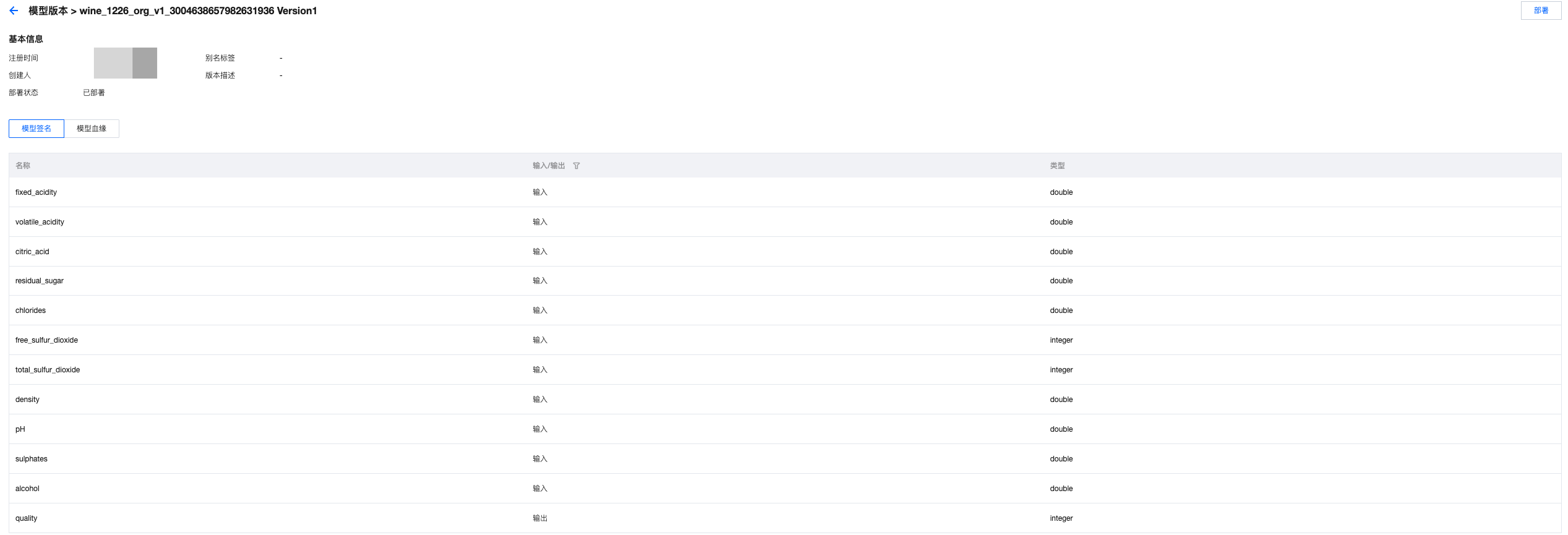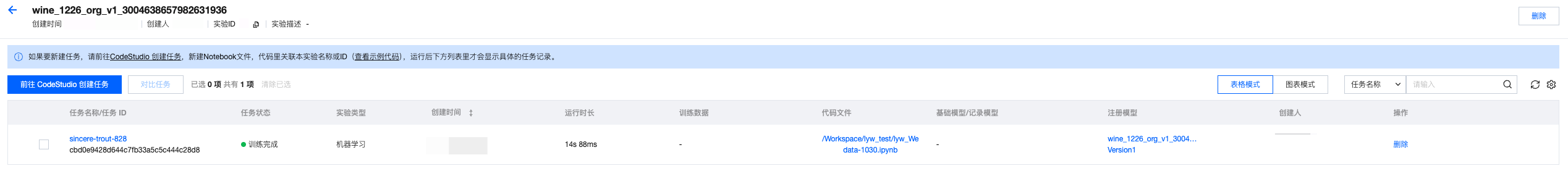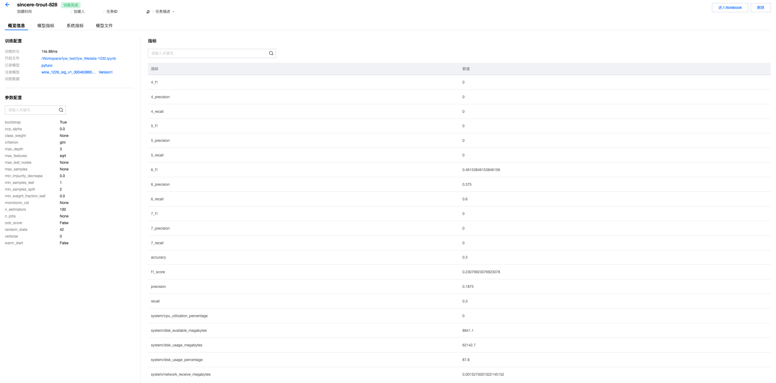 # 训练模型# Train modelfrom sklearn.model_selection import train_test_splitfrom sklearn.metrics import classification_reportfrom sklearn.ensemble import RandomForestClassifierimport mlflow.sklearnimport pandas as pdimport osproject_id=os.environ["WEDATA_PROJECT_ID"]mlflow.set_experiment(experiment_name=expirement_name)# 将Spark DataFrame转换为Pandas DataFrame用于训练# Convert Spark DataFrame to Pandas DataFrame for trainingtrain_pd = training_df.toPandas()# 删除时间戳列# Delete timestamp columns# train_pd.drop('event_timestamp', axis=1)# 准备特征和标签# Prepare features and tagsX = train_pd.drop('quality', axis=1)y = train_pd['quality']# 划分训练集和测试集# Split trainset and testsetX_train, X_test, y_train, y_test = train_test_split(X, y, test_size=0.2, random_state=42)# 把日期转成时间戳(秒)# Convert datatime to timestamp(second)for col in X_train.select_dtypes(include=['datetime', 'datetimetz']):X_train[col] = X_train[col].astype('int64') // 10**9 # 纳秒→秒# 确认没有缺失值导致 dtype 被降级为 object# Verify that no missing values cause the dtype to be downgraded to object.X_train = X_train.fillna(X_train.median(numeric_only=True))# 初始化并训练模型# Initialize, train and log the model.model = RandomForestClassifier(n_estimators=100, max_depth=3, random_state=42)model.fit(X_train, y_train)with mlflow.start_run():client.log_model(model=model,artifact_path="wine_quality_prediction", # 模型文件路径名model artifact pathflavor=mlflow.sklearn,training_set=training_set,registered_model_name=model_name, # 模型名称(开启catalog后需要写catalog的模型名称)model name(if enable catalog, must be catalog model name))