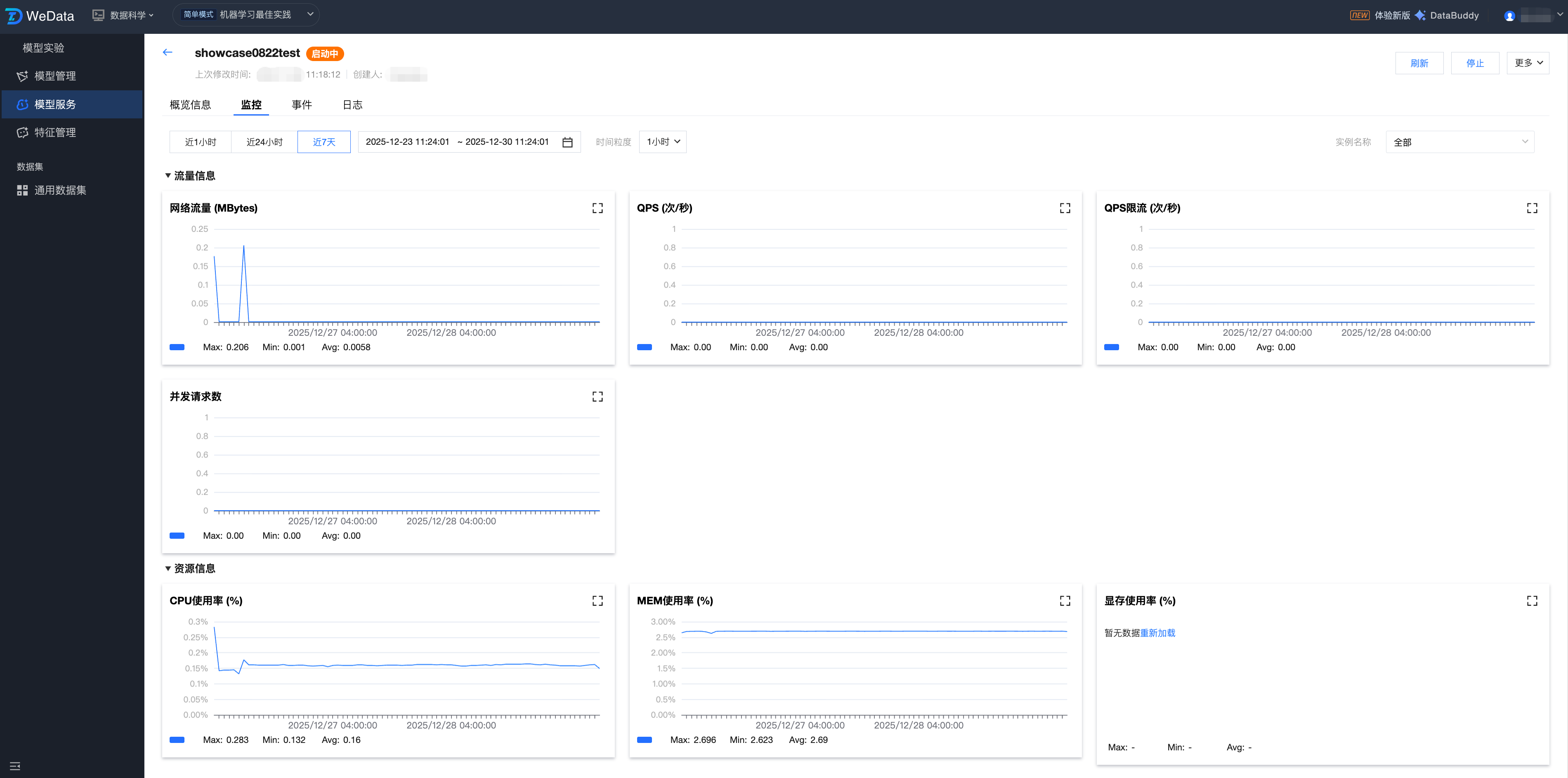 | 监控 | 查看服务的性能指标视图。 | 包含 QPS、并发请求数及 CPU/MEM/GPU 资源使用率监控。 |