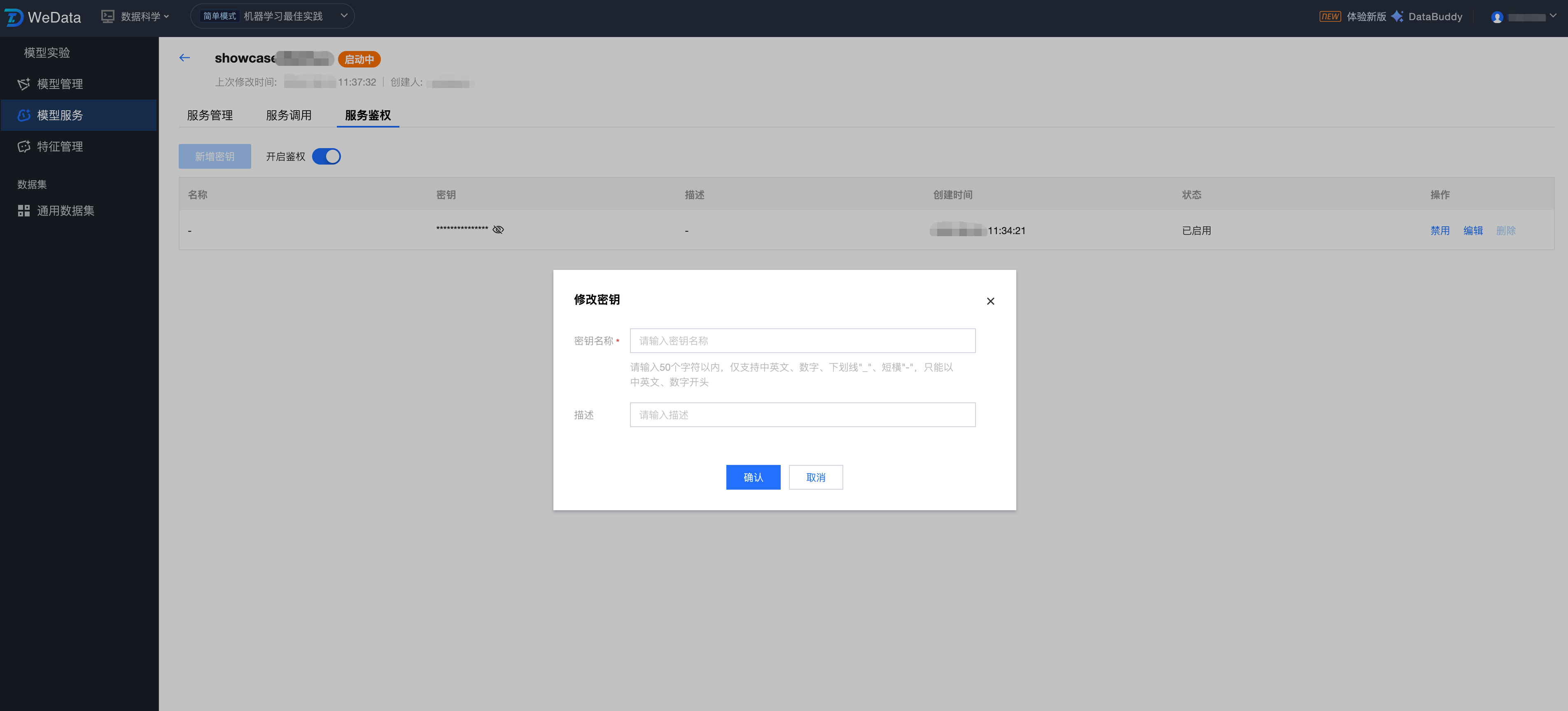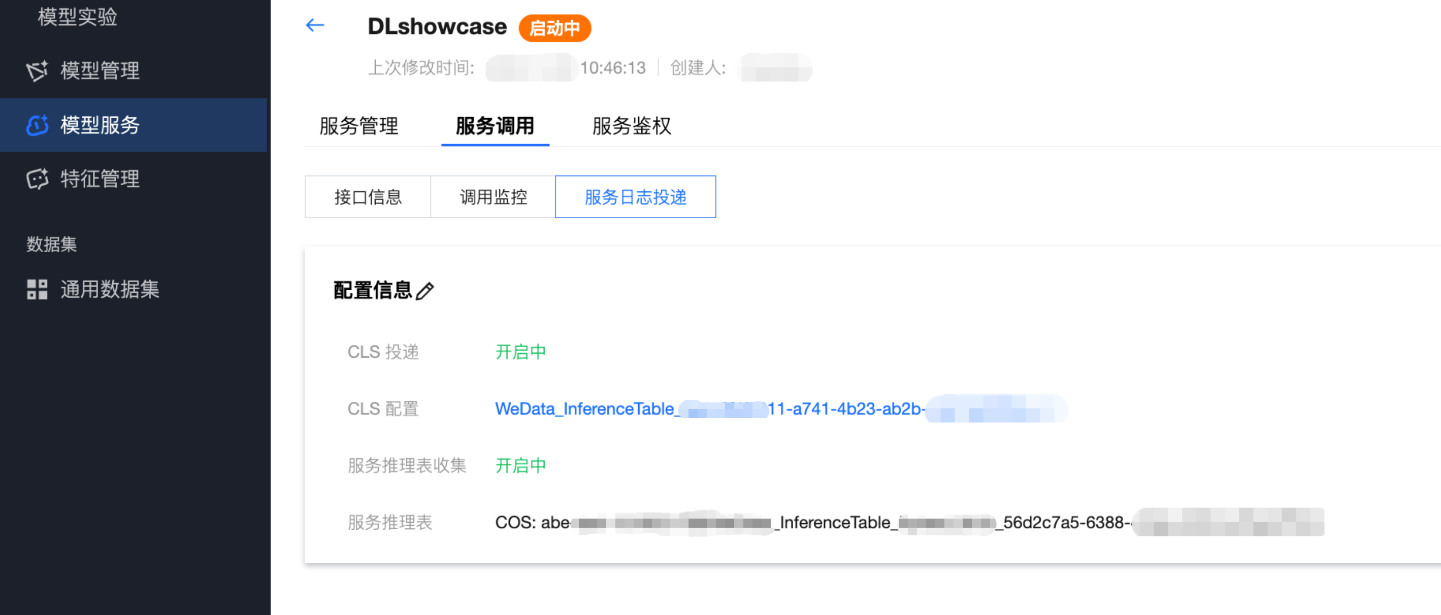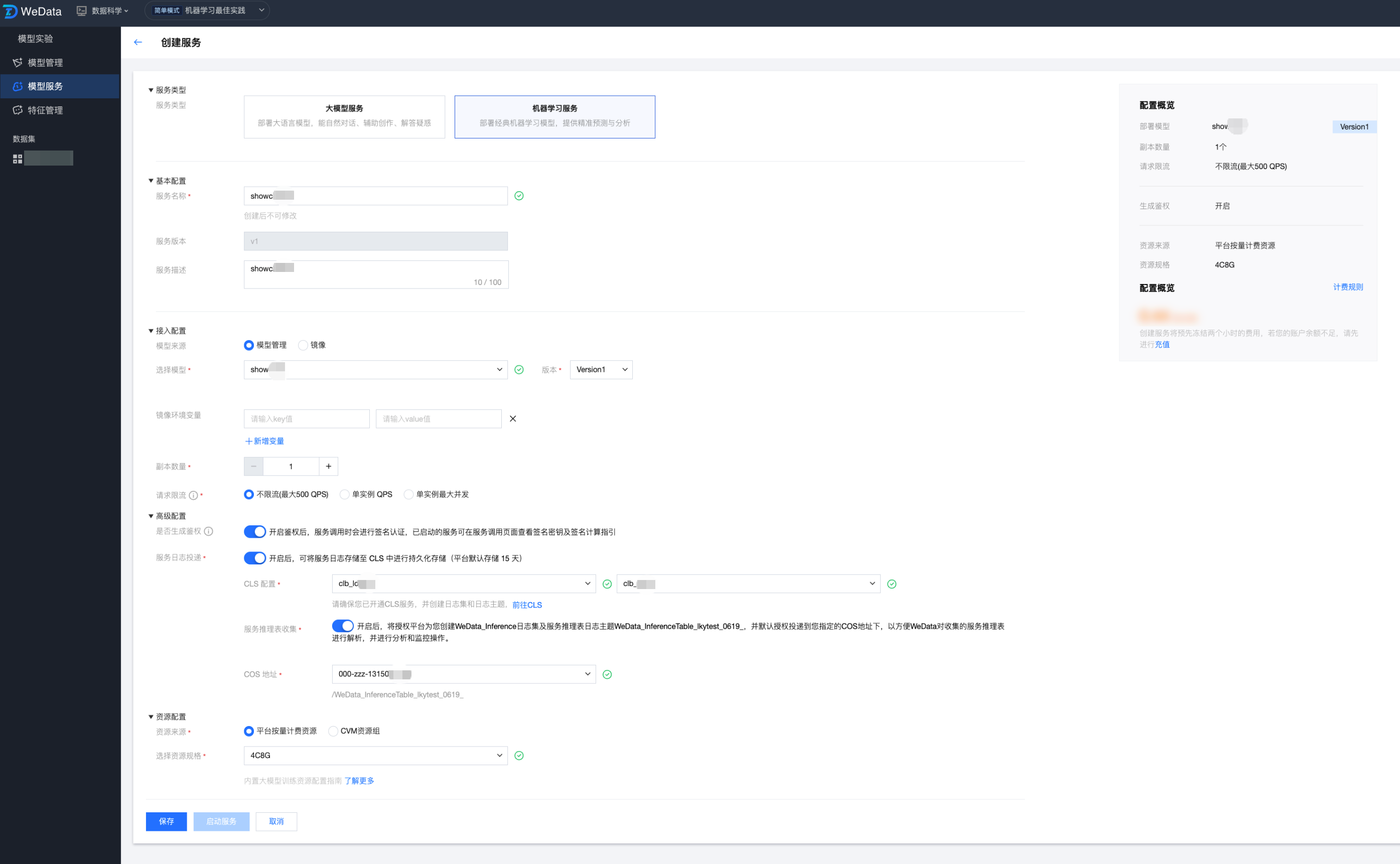 服务名称 | | 模型服务的唯一标识名称。 | 建议根据业务用途命名,支持点击进入服务详情页。 |