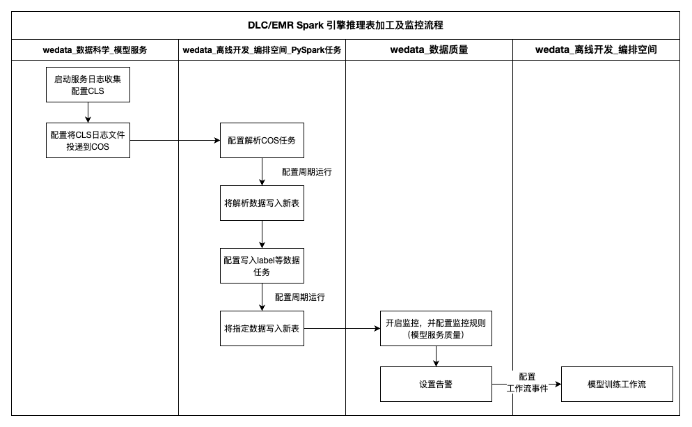 """该样例演示了如何使用 Spark Streaming 流式读取 COS 存储中的推理表,并对关键字段(特征、预测值)进行加工处理后写入 DLC 内表的处理过程。## 前提条件1. 确保该 DLC 引擎关联的 COS 访问凭证有访问推理表存储桶的权限。2. 确保模型服务开启了推理表监控。## 如何运行在修改教程中的参数后,在离线开发->编排空间中选择DLC PySpark任务运行。## 定时调度修改相应参数并调试完成后,您可以将该任务配置为定时执行,以便持续加工推理表数据。您还可以将加工后推理表数据与标签数据进行关联,生成包含标签数据的推理表,并在数据质量模块为推理表配置机器学习相关监控指标,持续监控模型质量。"""from pyspark.sql import DataFrame, SparkSessionfrom pyspark.sql import functions as Ffrom pyspark.sql import types as Tfrom typing import Union, List, Dict, Optional, Sequence, Anyfrom pyspark.sql.streaming import StreamingQueryfrom pyspark.sql.types import (StructType, StructField, StringType, LongType, DoubleType,ArrayType, TimestampType)"""### 定义原始推理表数据格式原始推理表数据按照特定结构以JSON格式存储在用户指定的COS桶中,request_schema代表用户输入请求结构,response_schema代表模型输出结构,请根据模型服务对应的实际输入输出格式进行调整,其余字段为推理表固定结构,一般不需要调整。"""request_schema = StructType([StructField("client_request_id", StringType(), True),StructField("dataframe_split", StructType([StructField("columns", ArrayType(StringType()), True),StructField("data", ArrayType(ArrayType(DoubleType())), True),]), True),])request_metadata_schema = StructType([StructField("model_name", StringType(), True),StructField("model_version", StringType(), True),StructField("service_id", StringType(), True),])response_schema = StructType([StructField("predictions", ArrayType(LongType()), True),])schema = StructType([StructField("client_request_id", StringType(), True),StructField("execution_duration_ms", LongType(), True),StructField("request", request_schema, True),StructField("request_date", StringType(), True),StructField("request_metadata", request_metadata_schema, True),StructField("request_time", TimestampType(), True),StructField("requester", StringType(), True),StructField("response", response_schema, True),StructField("sampling_fraction", DoubleType(), True),StructField("status_code", LongType(), True),StructField("wedata_request_id", StringType(), True),])# 数据源参数SOURCE_PATH = "cosn://存储桶路径/" # 推理表存储路径CHECKPOINT_PATH = "cosn://存储桶路径/checkpoint" # check_point存储路径,建议与推理表存储路径一致# 结果表参数UNPACKED_TABLE_NAME = "DataLakeCatalog.test.unpacked_test_inference_table" # 结果表表名,需要为DLC内表的三段式表名称:<数据目录>.<数据库>.<数据表>MODEL_ID_COL = "model_id" # 结果表模型ID列,用于标识模型EXAMPLE_ID_COL = "example_id" # 结果表记录的唯一ID列,用户更新操作PREDICTION_COL = "prediction" # 预测值列名称FEATURE_COLUMNS = ["sepal_length", "sepal_width", "petal_length", "petal_width"] # 特征列名称,根据模型特征调整def process_requests(requests_raw: DataFrame) -> DataFrame:"""将请求特征展开为单独列,并与对应的预测结果配对Args:requests_raw: 待处理数据Return:处理后数据"""# 过滤成功请求requests_success = requests_raw.filter(F.col("status_code") == 200).drop("status_code")# 生成模型标识requests_identified = requests_success \\.withColumn(MODEL_ID_COL, F.concat(F.col("request_metadata").getItem("model_name"), F.lit("_"), F.col("request_metadata").getItem("model_version"))) \\.drop("request_metadata")# 展开特征列和预测结果# 1. 获取特征列名、特征数据、预测值requests_with_features = (requests_identified.withColumn("feature_columns", F.col("request.dataframe_split.columns")).withColumn("feature_data", F.col("request.dataframe_split.data")).withColumn("predictions", F.col("response.predictions")))# 2. 将每个数据行与对应的预测结果配对requests_exploded = (requests_with_features.withColumn("feature_prediction_pairs",F.arrays_zip(F.col("feature_data"), F.col("predictions"))).withColumn("feature_prediction_pairs",F.explode(F.col("feature_prediction_pairs"))).withColumn("feature_row", F.col("feature_prediction_pairs.feature_data")).withColumn(PREDICTION_COL, F.col("feature_prediction_pairs.predictions")))# 3. 动态创建特征列requests_with_feature_cols = requests_explodedfor i, col_name in enumerate(FEATURE_COLUMNS):requests_with_feature_cols = (requests_with_feature_cols.withColumn(col_name, F.col("feature_row")[i]))# 4. 添加记录唯一ID,便于后续进行upsert操作requests_with_example_id = requests_with_feature_cols \\.withColumn(EXAMPLE_ID_COL, F.expr("uuid()"))# 5. 清理临时列requests_processed = (requests_with_example_id.drop("feature_columns", "feature_data", "feature_prediction_pairs", "feature_row", "predictions", "request", "response"))return requests_processeddef create_table(spark: SparkSession,table_name: str,df: Optional[DataFrame] = None,partition_expr: str = None,description: Optional[str] = None,):"""创建dlc内表Args:spark: SparkSession 实例table_name: 表全称(格式:数据目录.数据库.数据表)df: 初始数据(用于推断schema)partition_expr: 分区列(优化存储查询)description: 表描述Raises:ValueError: 创建异常时抛出"""# 推断表schematable_schema = df.schema# 构建列定义columns_ddl = []for field in table_schema.fields:data_type = field.dataType.simpleString().upper()col_def = f"`{field.name}` {data_type}"if not field.nullable:col_def += " NOT NULL"columns_ddl.append(col_def)# 构建建表语句ddl = f"""CREATE TABLE IF NOT EXISTS {table_name} ({', '.join(columns_ddl)})USING icebergPARTITIONED BY ({partition_expr})TBLPROPERTIES ('comment'= '{description or 