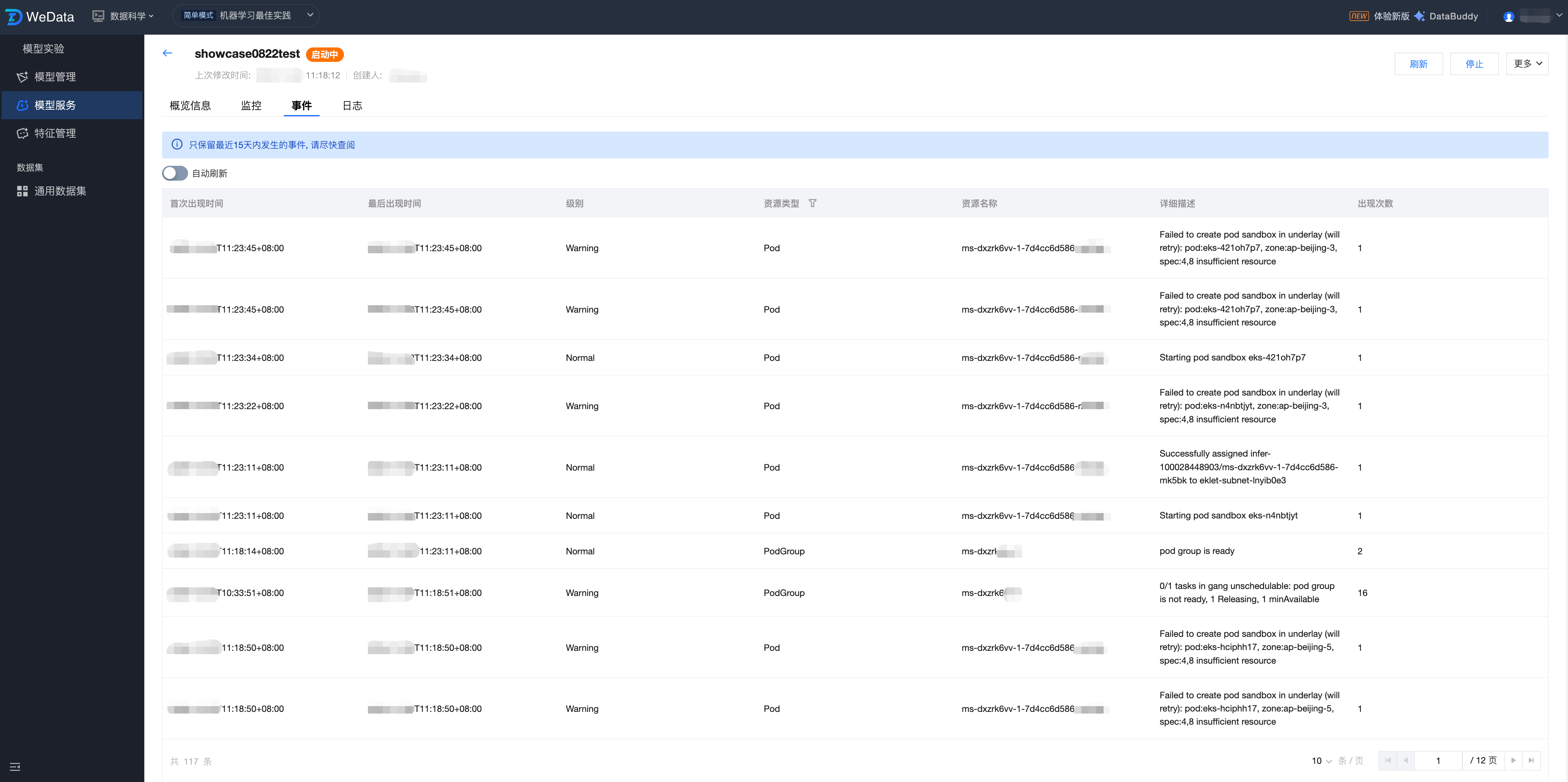| 日志 | 查看模型运行时的容器日志。 | 支持按实例筛选和时间范围检索,用于定位服务组异常原因 |