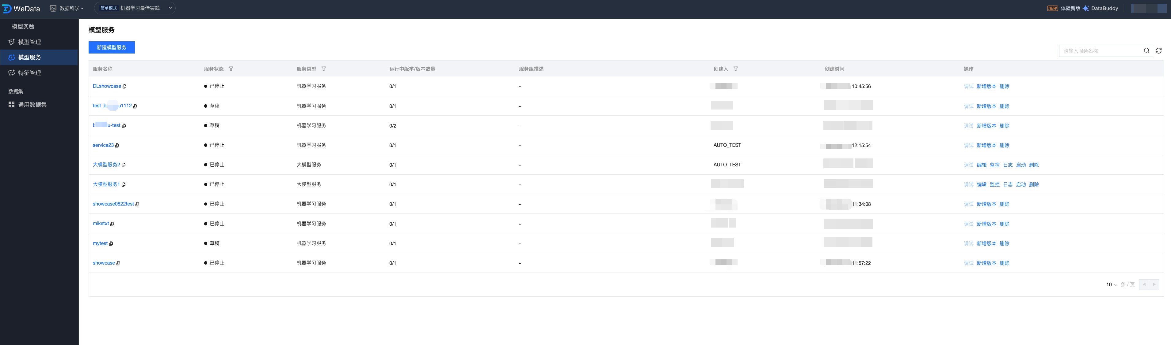 创建时间 | | 该服务版本首次被创建的时间。 | 系统自动记录,方便按时间维度追踪模型迭代过程。 |