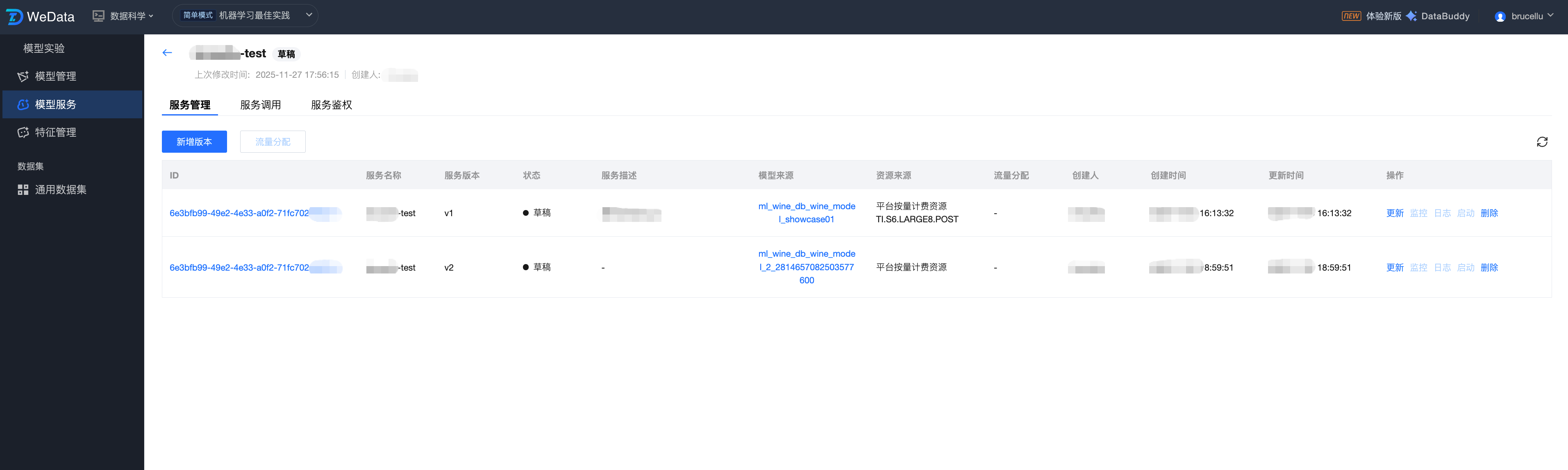模型来源 | | 发布该服务所关联的底层模型资产。 | 展示该服务使用的是模型管理模块中哪个具体模型名称(如 ml_wine_db_wine_model)。 |