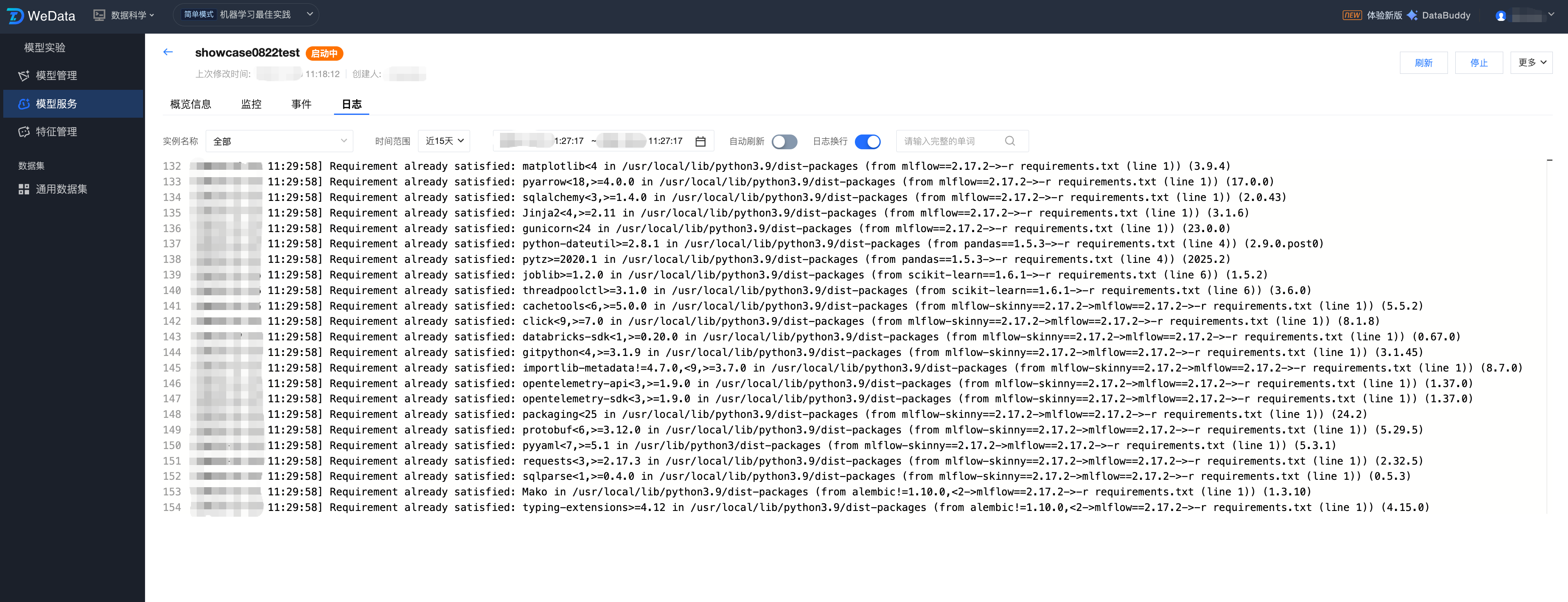 | 日志 | 检索该服务实例的运行日志。 | 用于排查模型代码报错、输入输出异常等运行期问题。 |