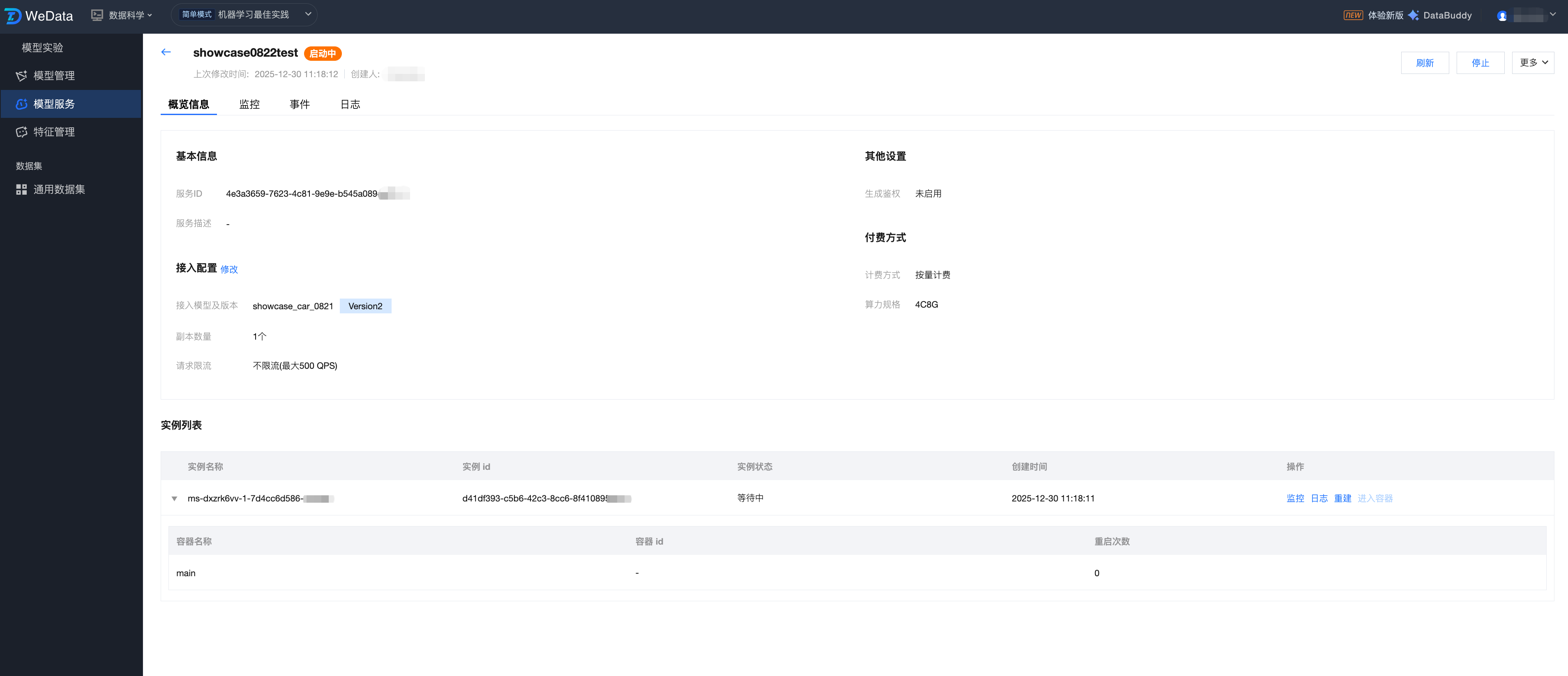 实例状态 | 实例的物理状态。 | Waiting 表示正在拉取镜像或等待调度;Running 表示服务已就绪。 |