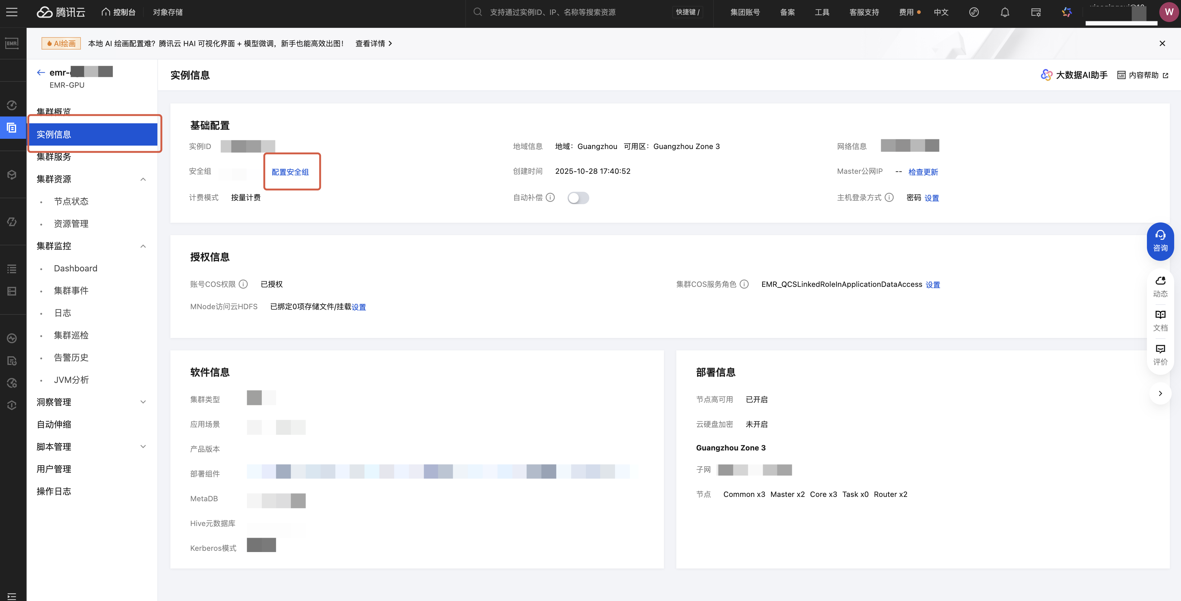 1. 进入 EMR 控制台,选择具体引擎 > 实例信息 > 配置安全组。 2. 单击具体的安全组,入站规则添加:30.22.32.0/19 TCP:8888,单击确定。