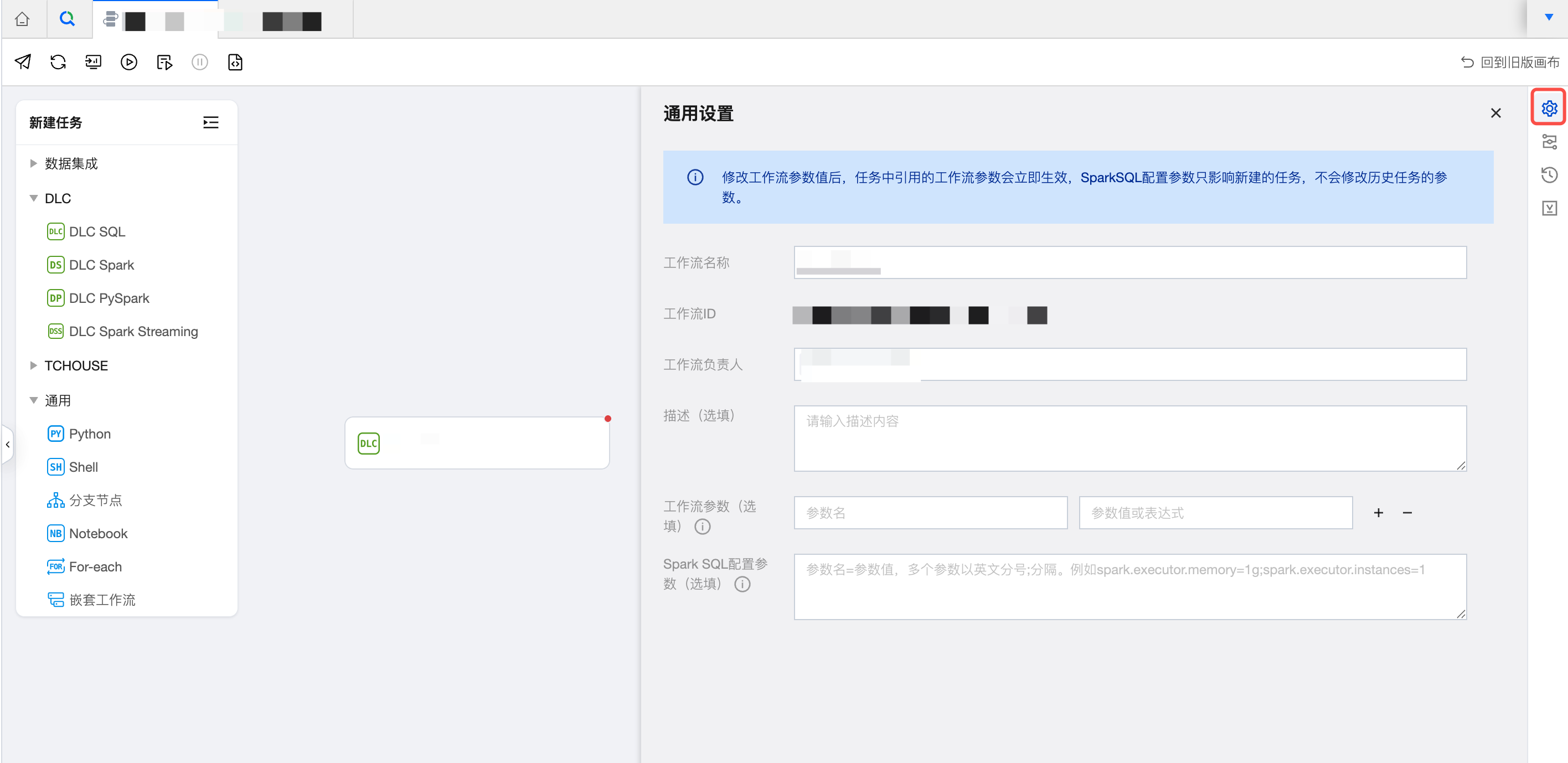 打开右侧抽屉通用配置,完成工作流名称、工作流负责人、描述、工作流参数、Spark参数等基础信息的配置。
