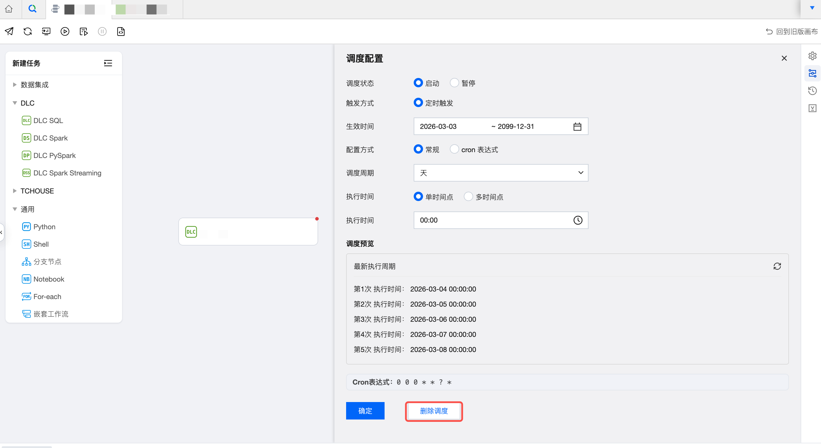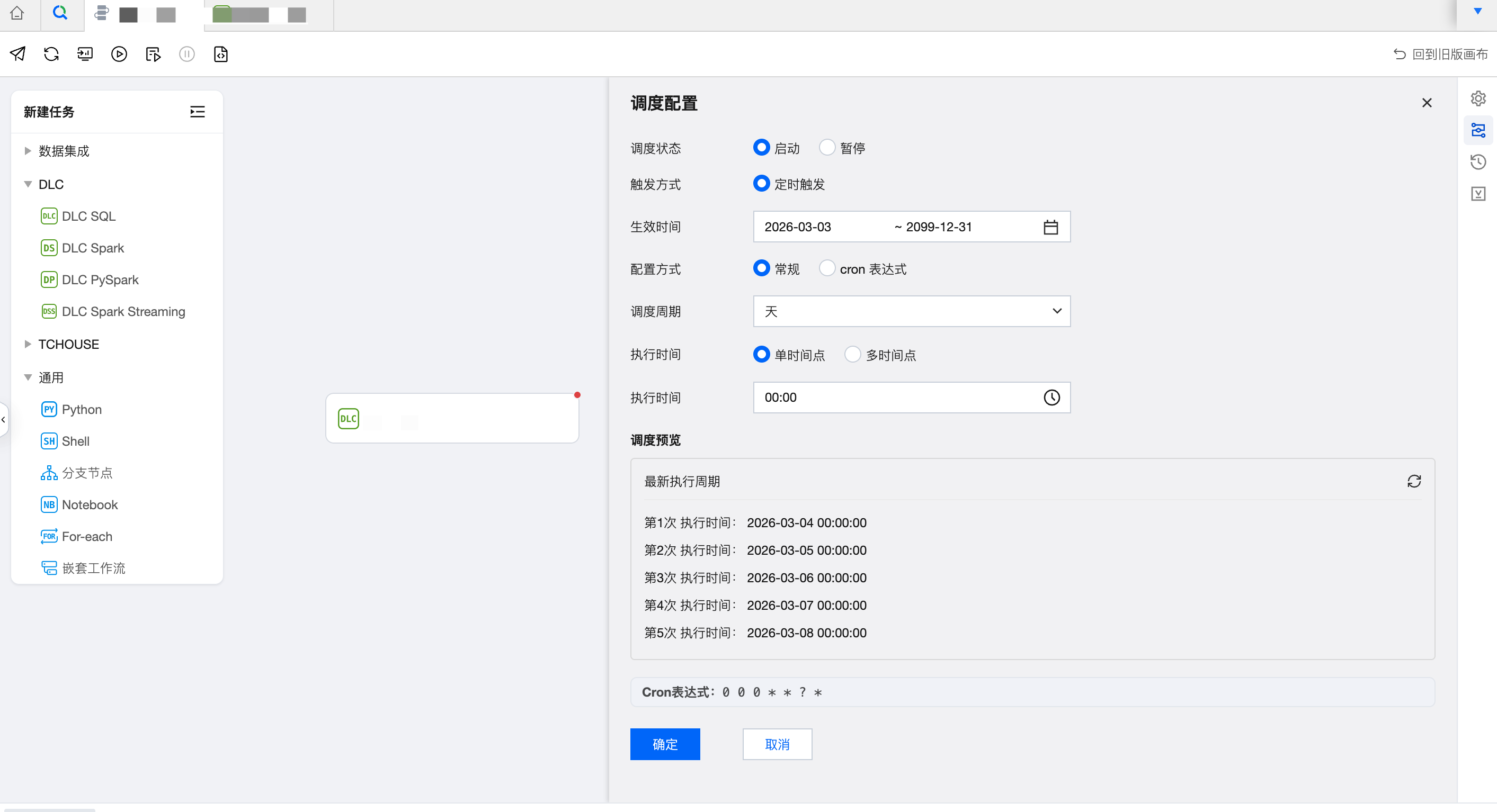 调度预览:完成调度配置后,可查看近5次调度时间,帮助您确定调度配置是否符合预期。