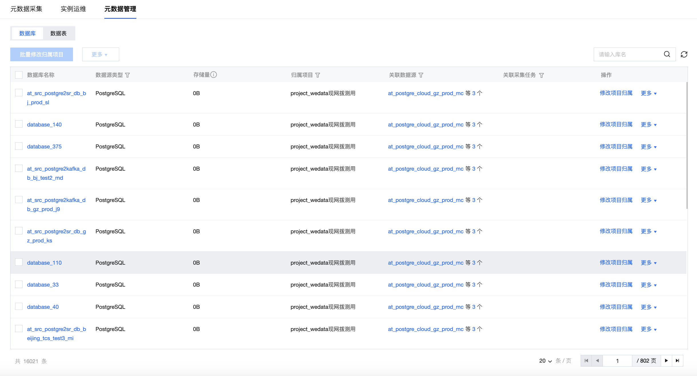 该页面展示全量元数据采集的数据库列表,包含数据库名、数据源类型、归属项目、存储量、关联数据源、采集任务等,支持批量修改归属项目、删除项目等操作。