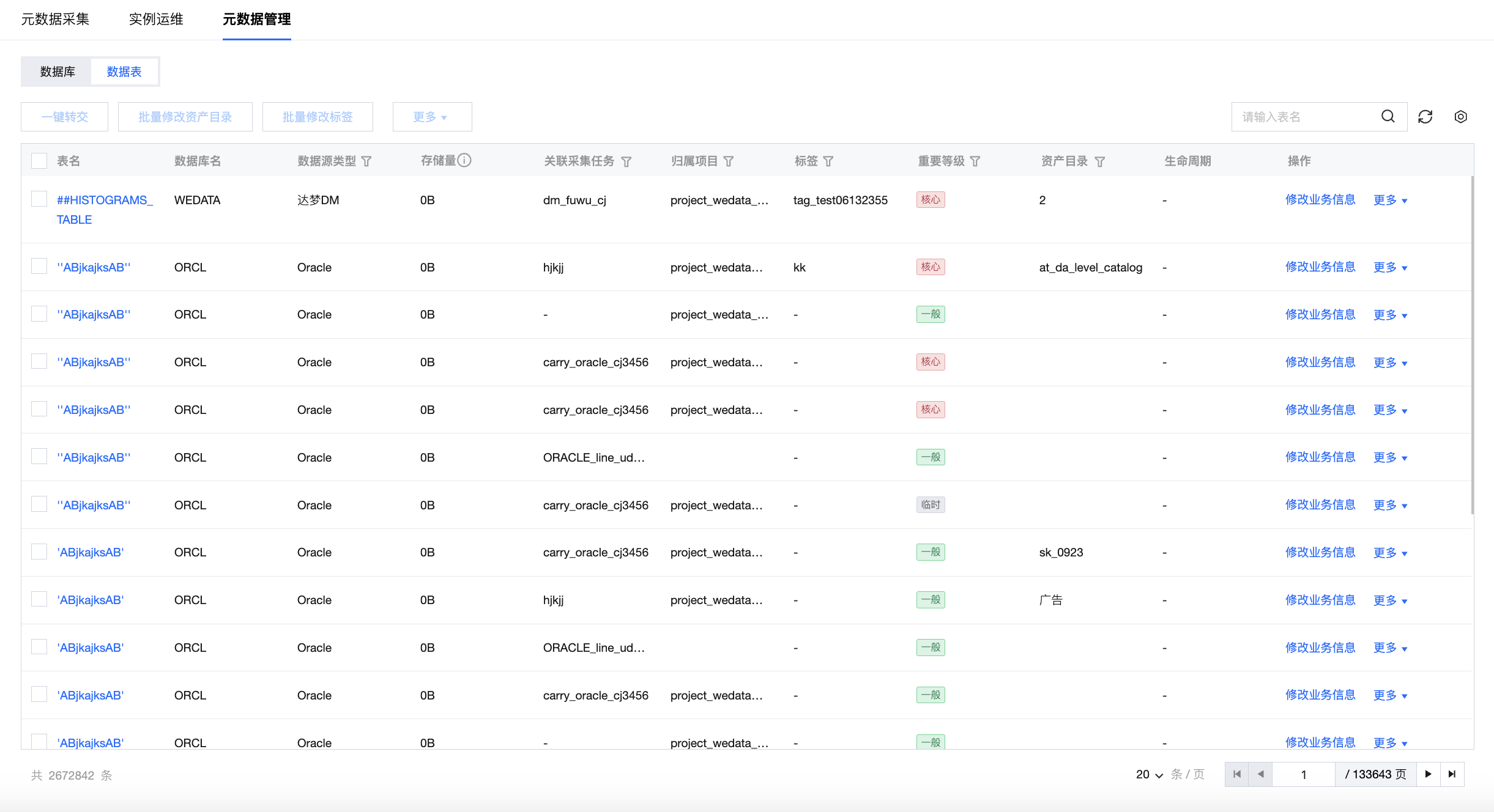 ,该页面展示全量元数据采集的表列表,包含表名、数据库名、标签、重要等级、资产目录、数据源类型、数据源、关联采集任务等,支持一键转交和批量修改业务属性以及删除等操作。
