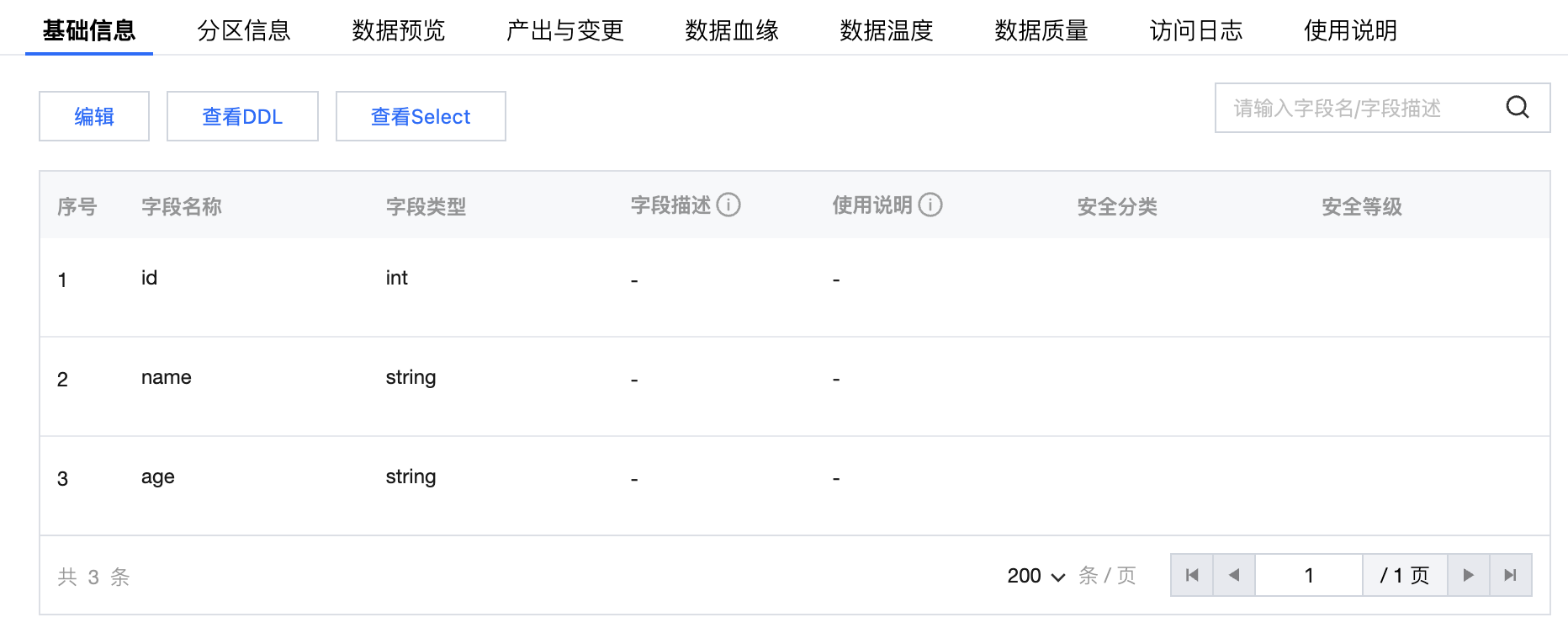 提供编辑、查看 DDL 和查看 Select 功能,并展示字段名称、字段类型、字段描述、使用说明、安全等级和安全分类。