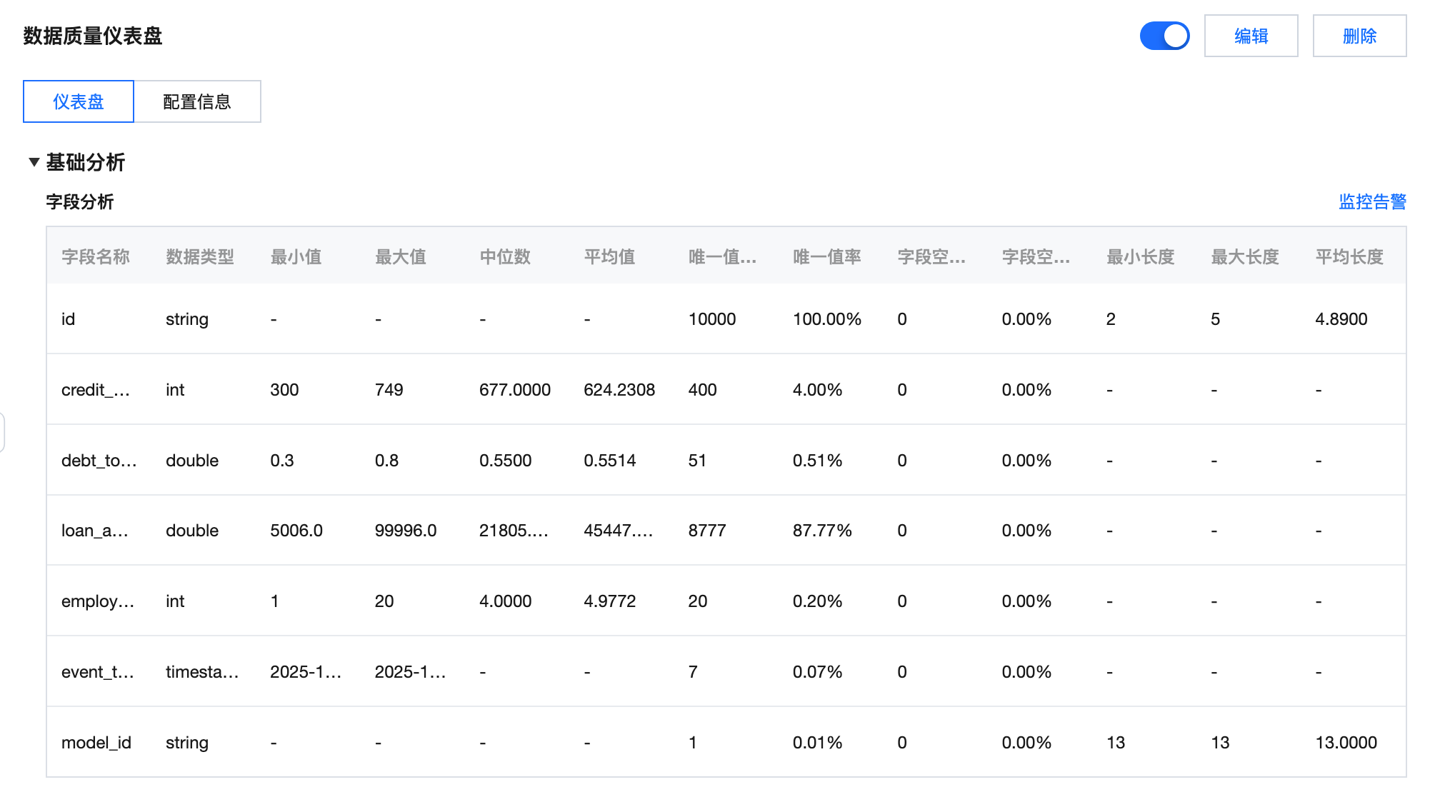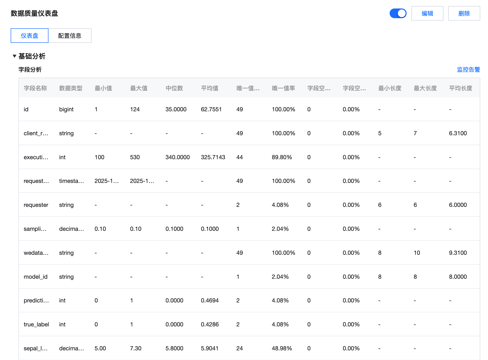 对于时序表,可查看字段分析数据、数据漂移指标。