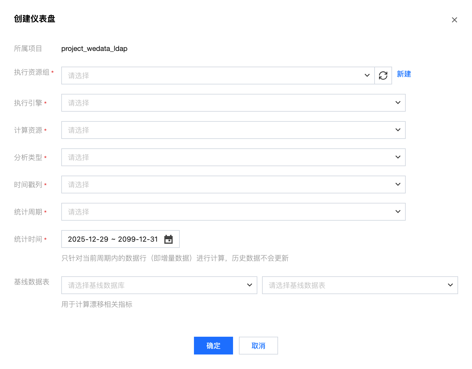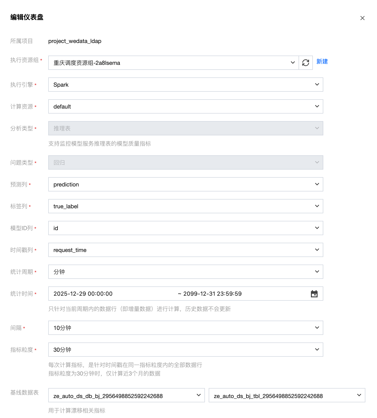 基线数据表 | 选填。以某一固定时间点或标准状态为基准,用于对比分析数据变化的参照数据。用于计算漂移相关指标。若未填写,漂移指标计算结果为空 |