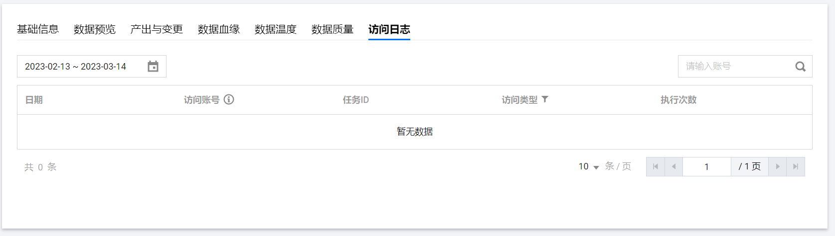 访问日志提供数据表被访问情况的统计概览,包括访问日期、访问账号、任务 ID、访问类型、执行次数等信息。