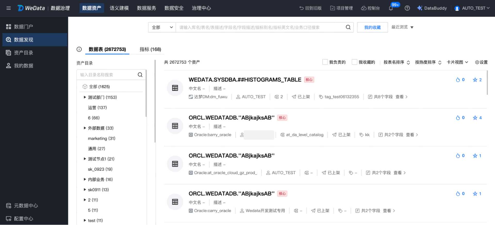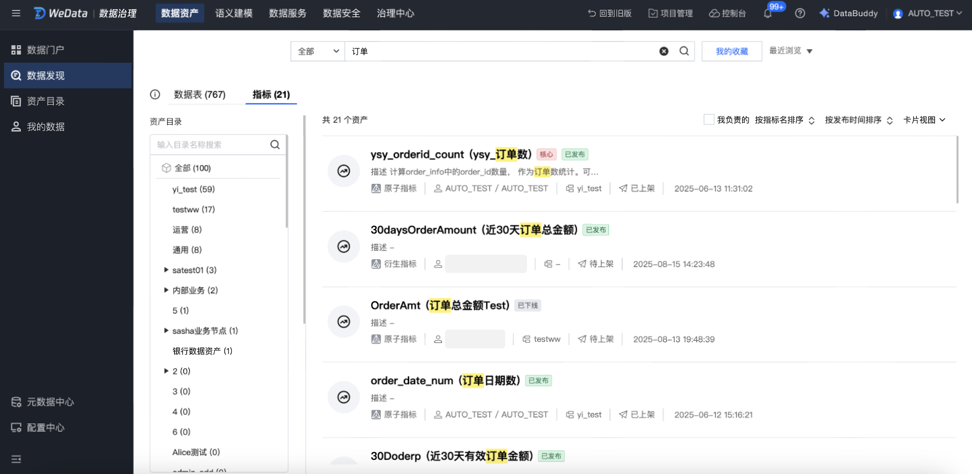 数据发现是 WeData 中面向全域数据资产的统一搜索与浏览入口。通过整合多种数据源中的元数据,为用户提供一个能够快速查找、理解和评估数据资产的平台级能力。用户可在数据治理页面单击数据资产,然后在左侧导航栏选择数据发现进入相应页面。