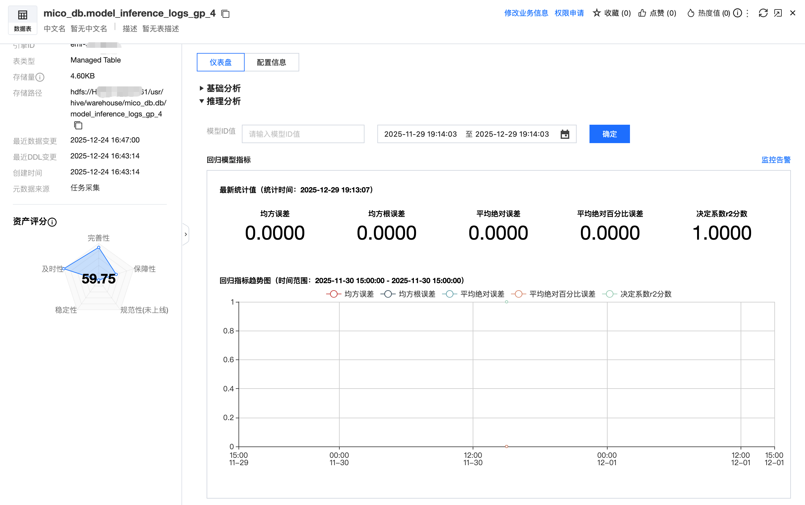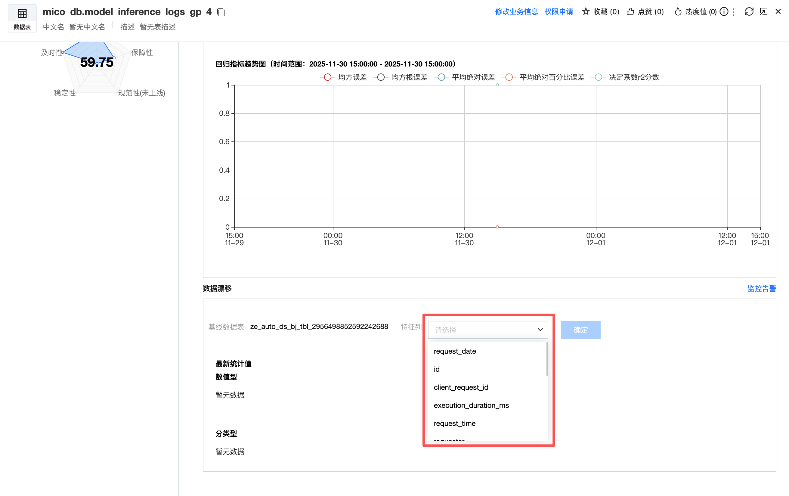 对于推理表,可查看字段分析数据、回归/分类指标、数据漂移指标。