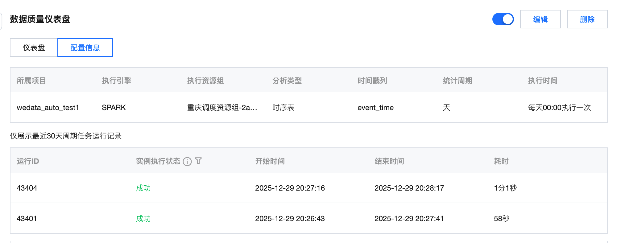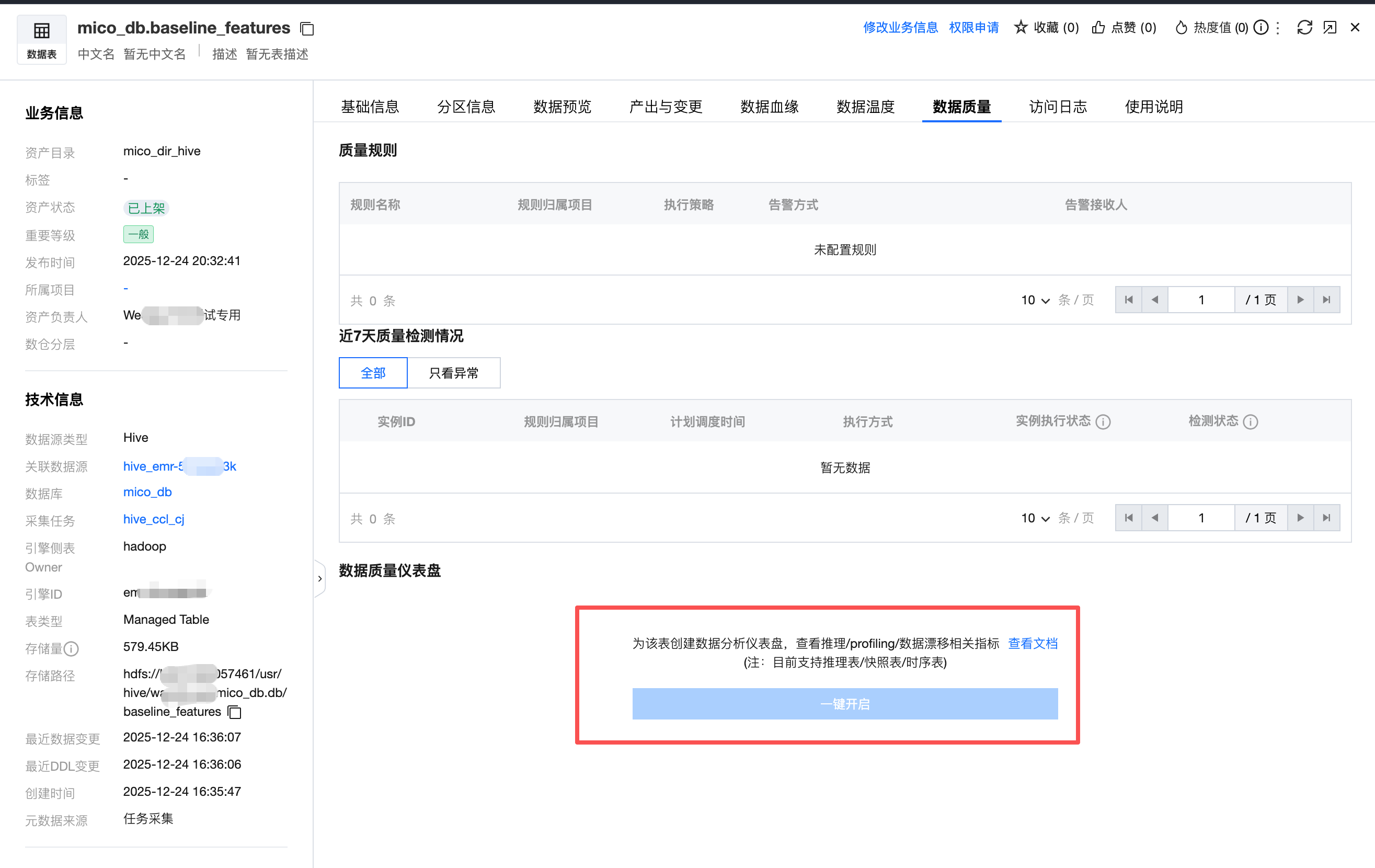 1、在数据资产>表详情>数据质量 tab下,开启数据质量仪表盘开关