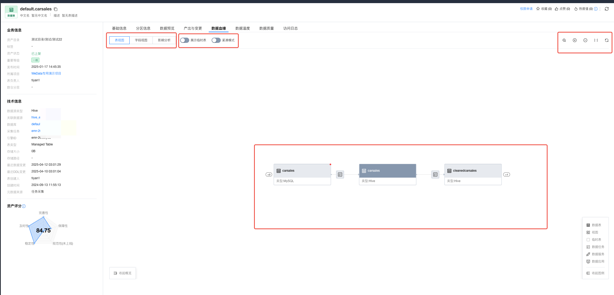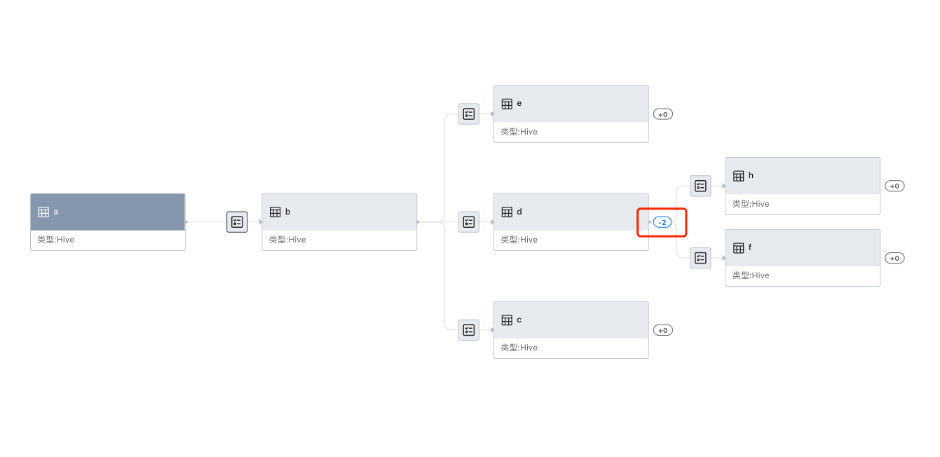 表血缘/字段血缘/影响分析 | 支持切换表/字段维度展示血缘关系 表血缘:以表为粒度展示表间上下游关系,画布中一个节点表示一张表。默认展示中心表直接一级上下游正式表血缘。 字段血缘:以字段为粒度展示表间某一字段的上下游关联字段,画布中一个节点表示一个字段。字段血缘默认以表的第一个字段作为中心。 影响分析:以当前表为核心,分析该表对任务和表的影响和依赖关系。 |