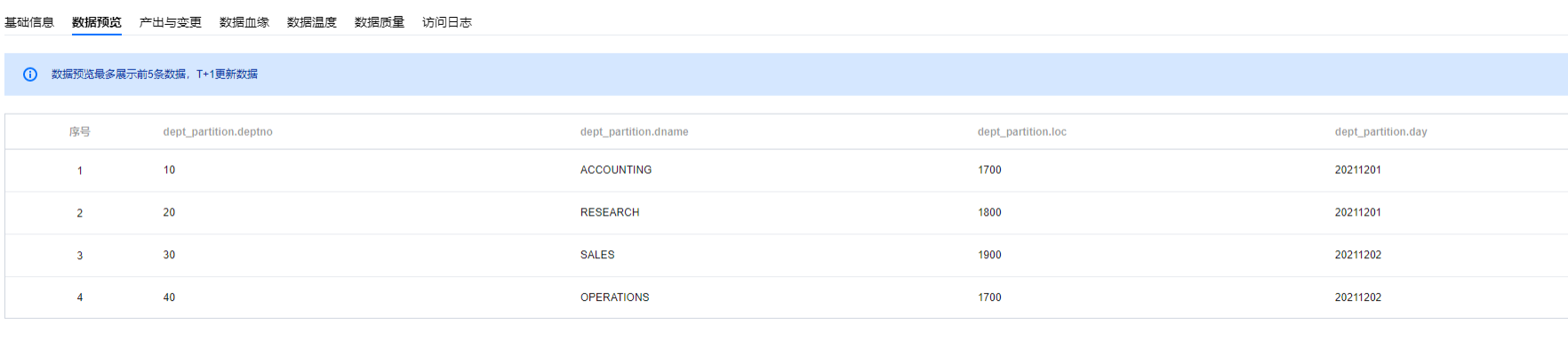 预览该数据表内容,最多支持展示前5条数据,T+1更新数据。