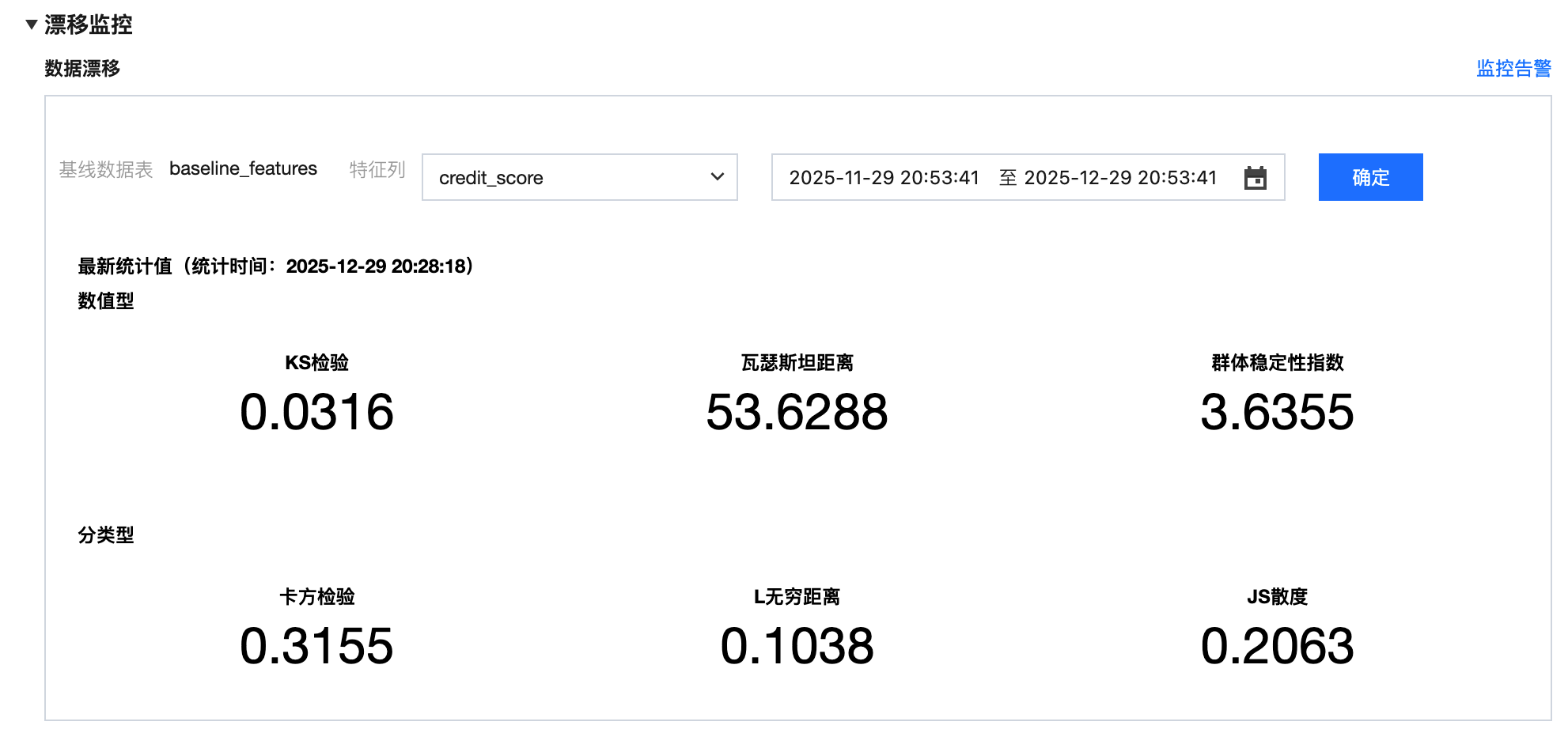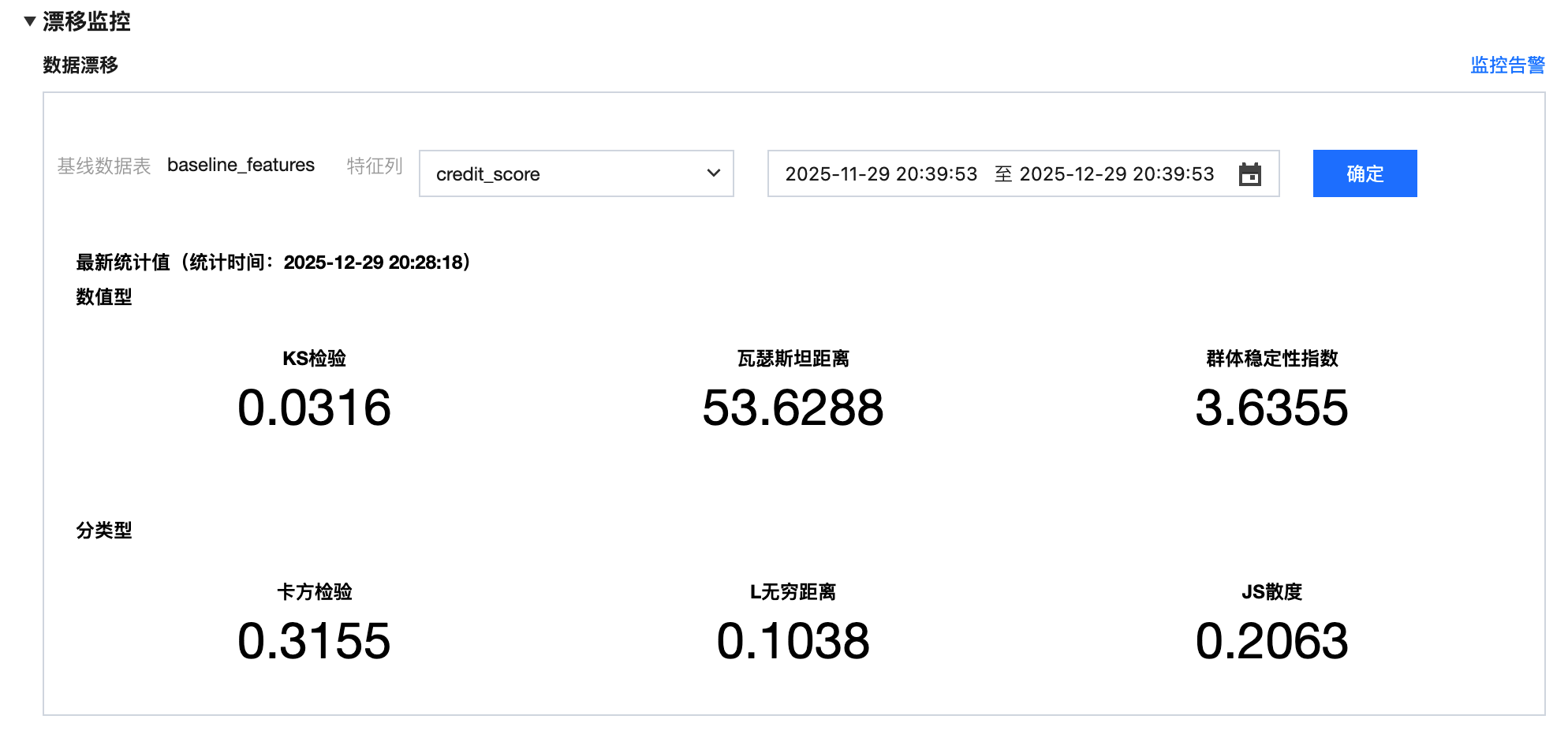 2. 基线数据表和监控表的特征列必须完全对齐(字段名称、字段类型、字段含义、取值范围一致),否则两者无法进行有效对比,漂移指标会因 “无匹配维度” 返回空结果。