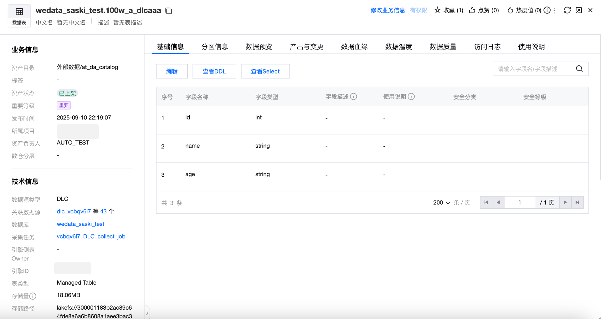 展示当前数据表的数据源类型、数据源、数据库、采集任务、引擎侧 Owner、引擎 ID、表类型、储存量、存储路径、生命周期、最近数据及 DDL 变更、创建时间和元数据来源。