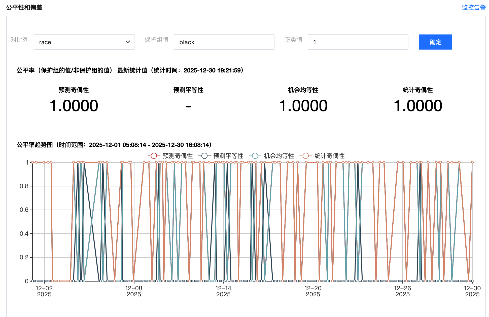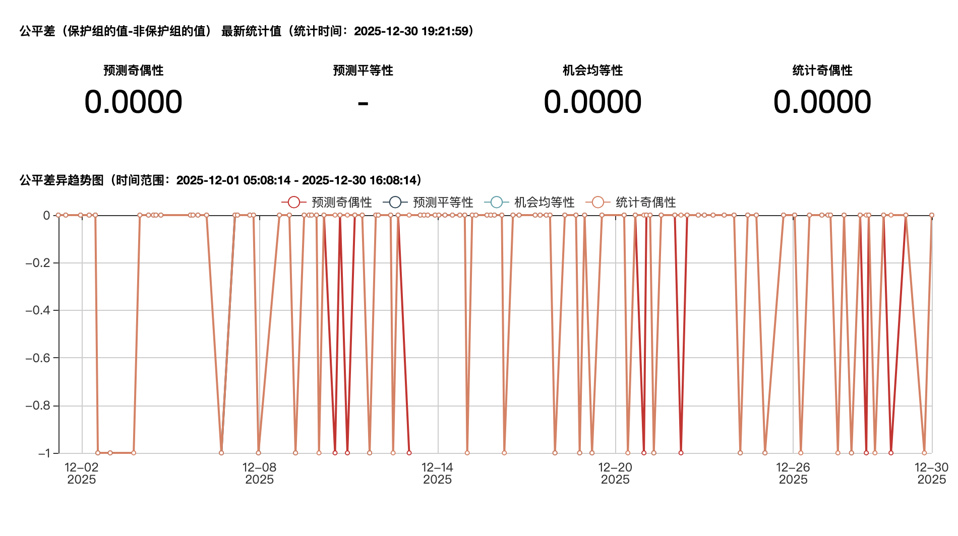 统计值为:预测奇偶性、预测平等性、机会均等性、统计奇偶性;图表为公平率趋势图