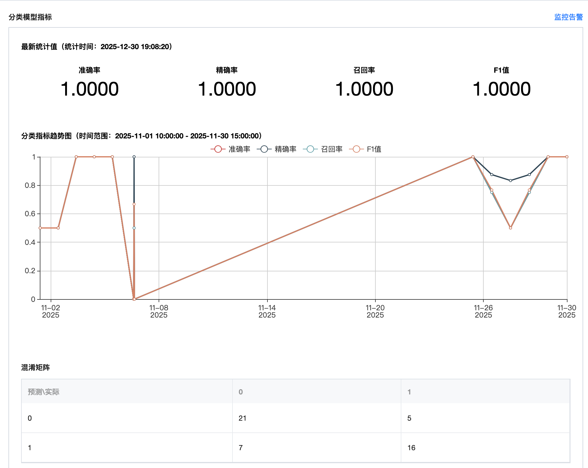 分类指标展示统计值和图表,统计值为:准确率、精确率、召回率、F1分数;图表为分类指标趋势图和混淆矩阵图。