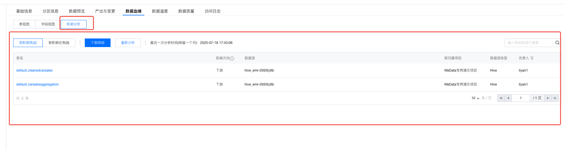 受影响表(2):显示关联的数据表对象(如图中 default.cleanedcarsales)。