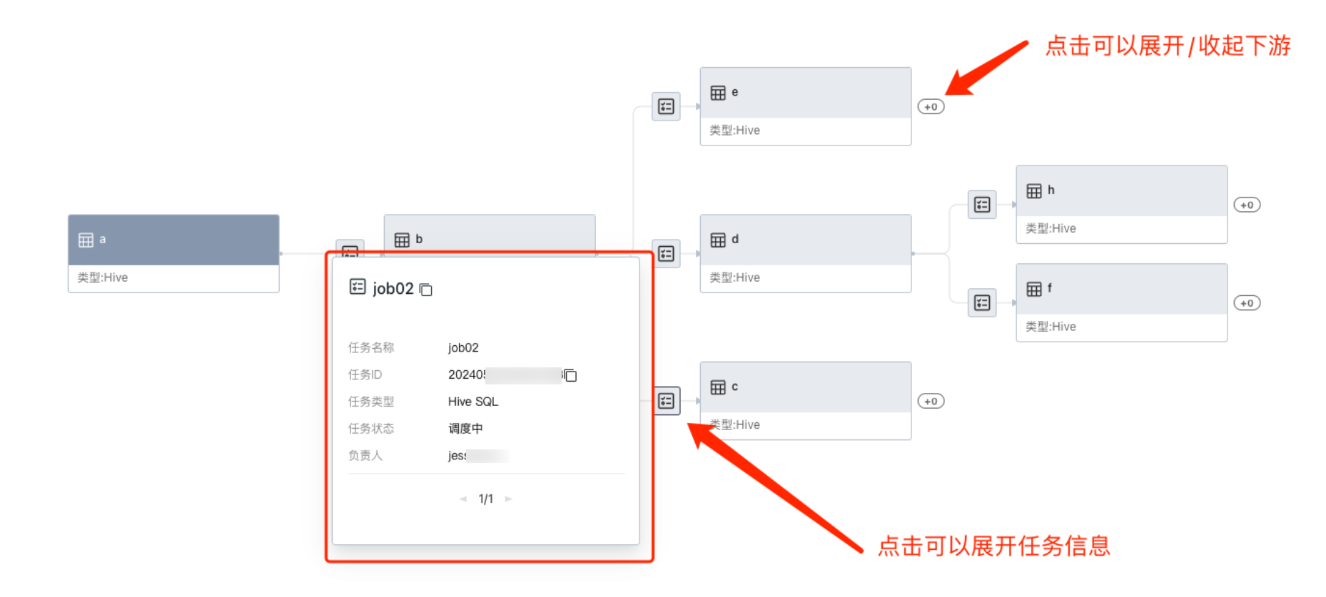 表血缘默认展示中心表直接一级上下游关联表数、上下游关联表、任务,支持选择目标表进行上/下游血缘追溯,一次展开所选表直接一级的全部上游/下游表,同级其他表血缘关系保持展开状态不变。
