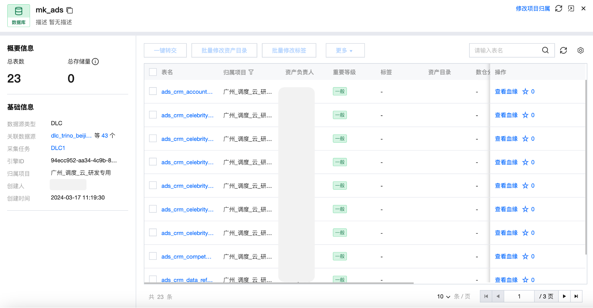 表列表主要展示了该数据库下所有数据表名称、负责人、重要等级、标签、资产目录、发布状态、存储量、以及其更新时间。单击表名后,将会跳转至表详情页面。