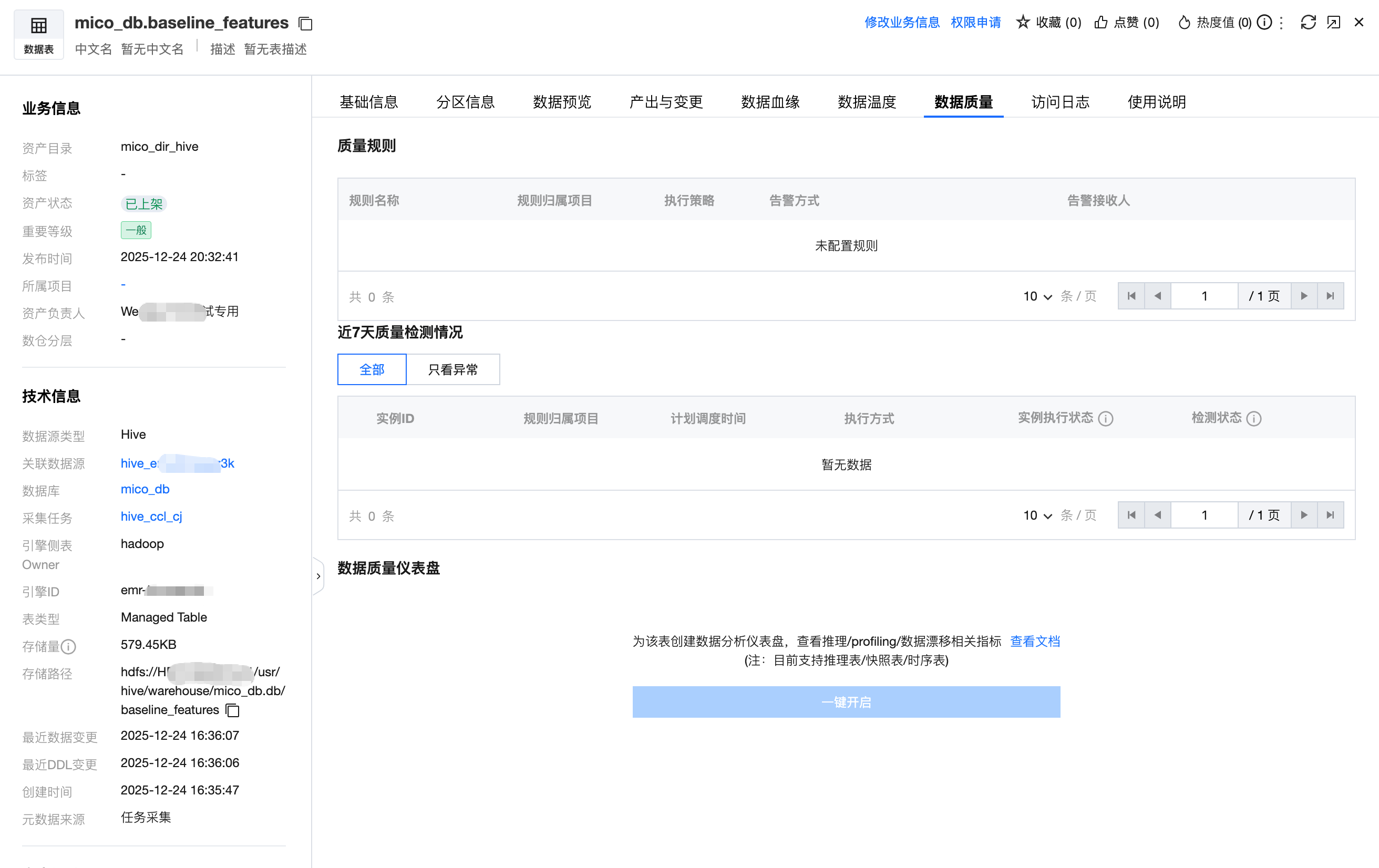 对于EMR-hive表,支持在此创建数据分析仪表盘,查看推理/profiling/数据漂移相关指标。其他类型的表无数据质量仪表盘入口。