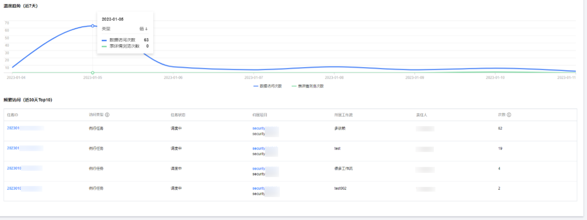 频繁访问:近30天访问最频繁的任务(任务 ID、访问类型、任务状态、归属项目、所属工作流、责任人和次数)。
