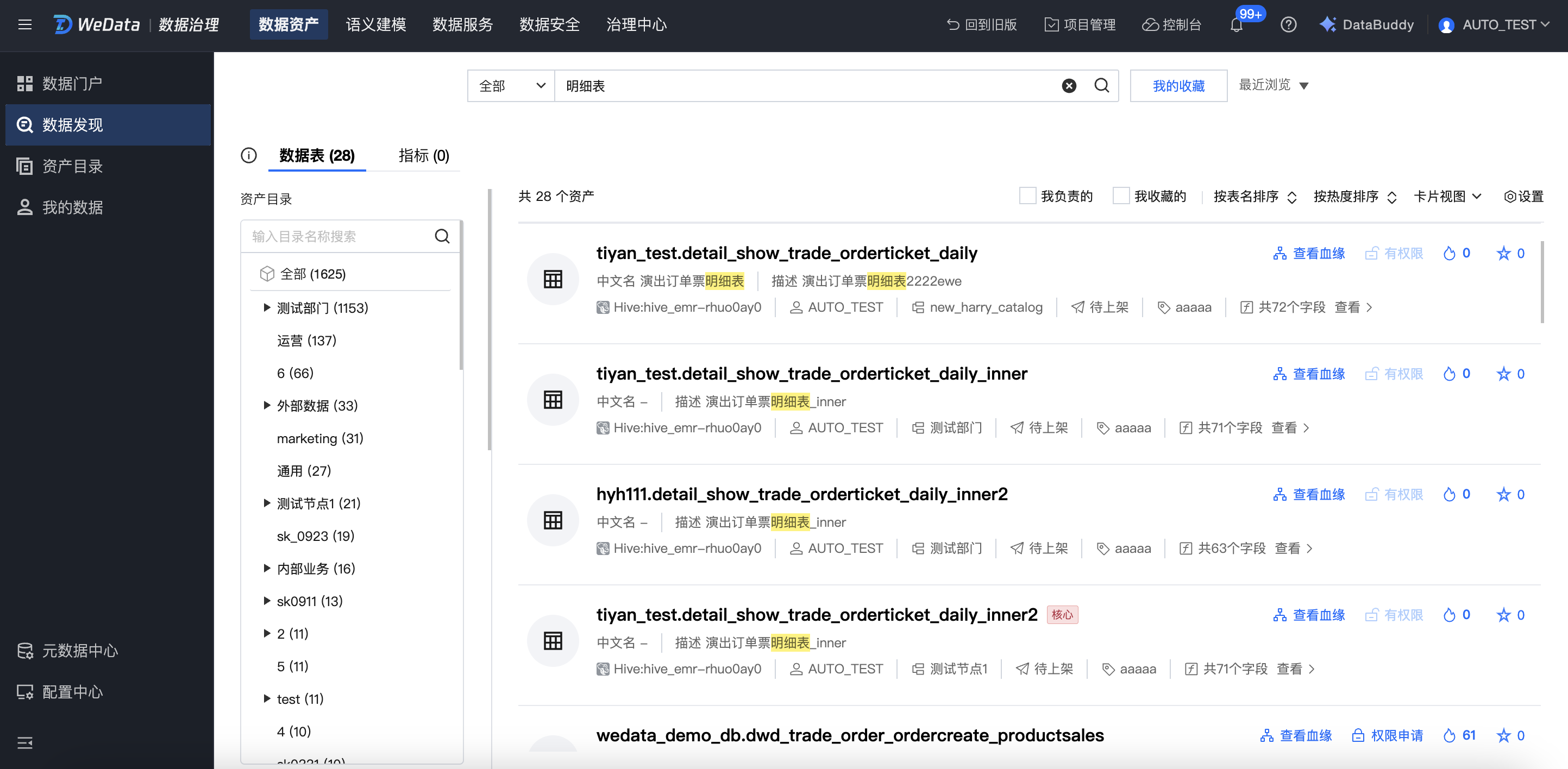 搜索结果会按照匹配度对相关的数据资产进行排序。搜索结果包含数据表和指标两个tab页,数据表列表包括数据源类型、负责人、资产目录、标签、字段等信息,提供查看血缘,权限申请,收藏/取消收藏等功能;指标列表包含指标名称、描述、指标类型、负责人、资产目录等信息。