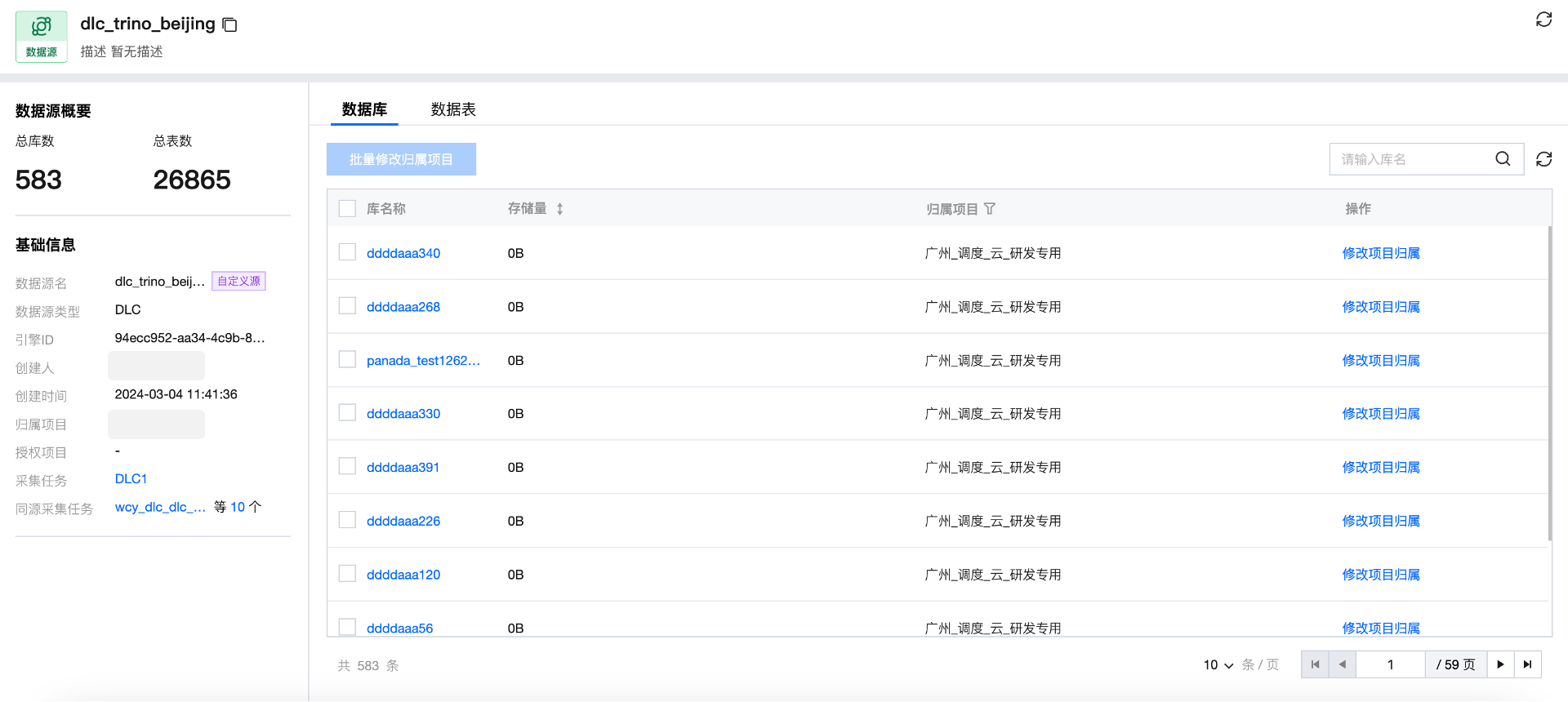 库列表主要展示了该数据源下所有数据库名称,储存量以及其归属项目。您可以在此批量修改该数据源下数据库的归属项目。单击库名称后,将会跳转至该库的数据库详情页面。