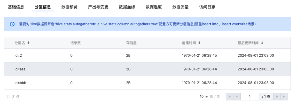 在数据治理的各个功能相应的页面下,单击需要查看的表名即可进入表详情页面。根据数据源的不同,表详情页面包含了表的业务信息、技术信息、资产评分,基础信息、数据预览、产出与变更、数据血缘、数据温度、分区信息、数据质量、访问日志和使用说明。