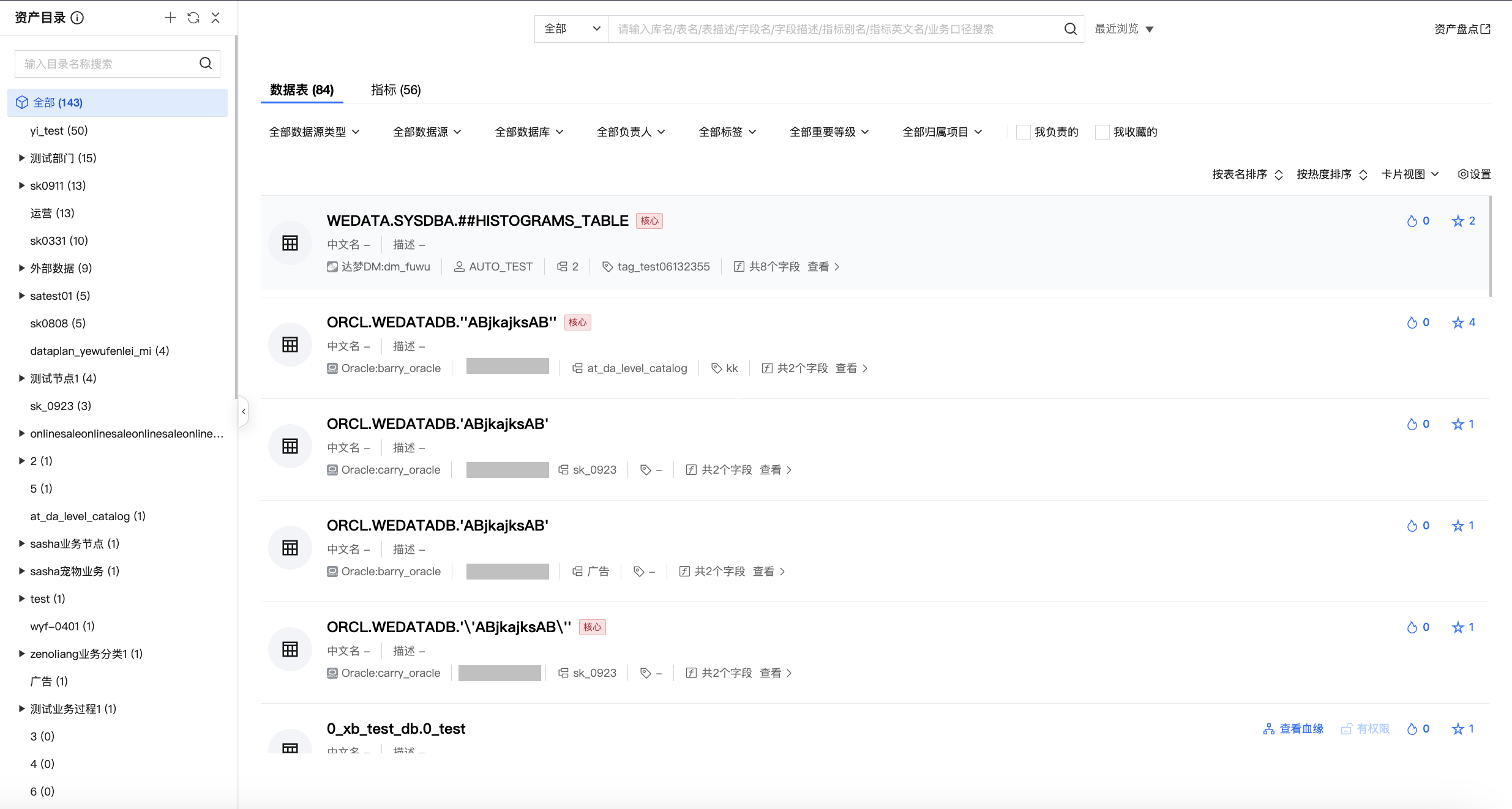 数据表列表:包括数据源类型、负责人、资产目录、标签源、字段等信息,提供查看血缘,权限申请,收藏/取消收藏等功能。