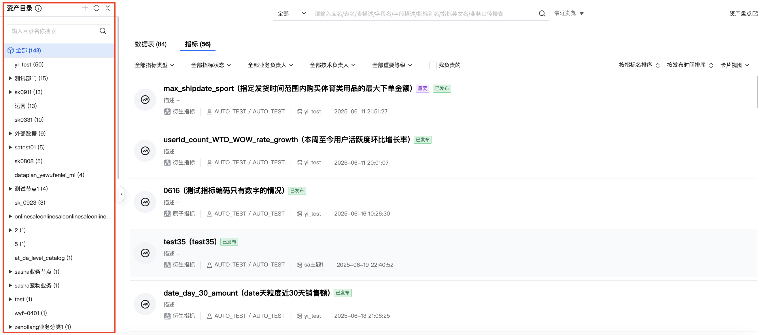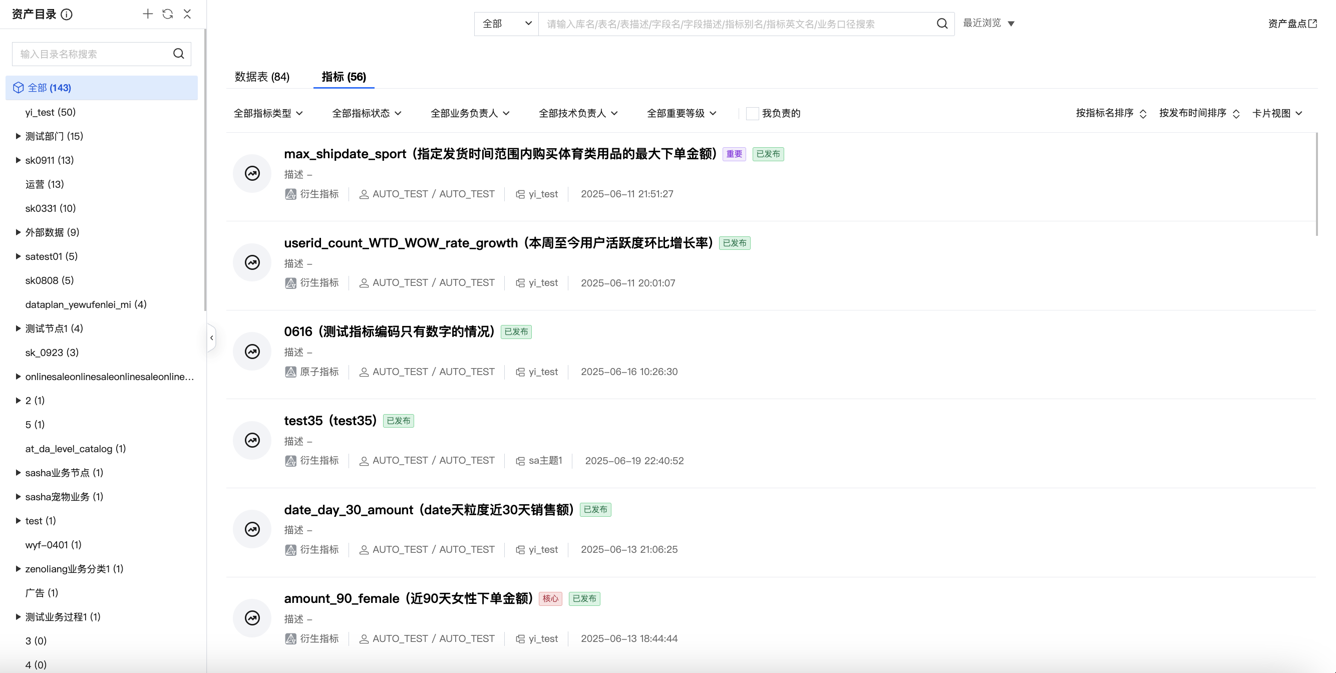 指标列表:展示所有上架的指标,展示指标名、描述、指标类型、负责人、资产目录等信息。