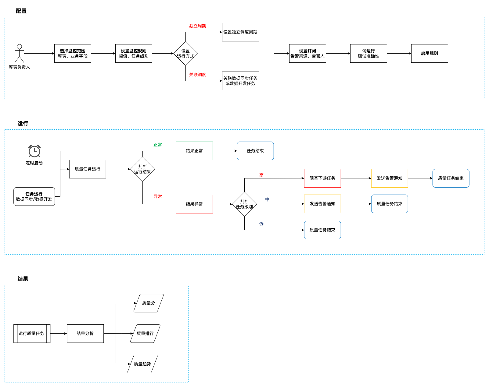 运维管理 | 执行实例与结果: 支持查看质量任务的运行结果,并可查看每条规则历史运行情况; 支持导出执行结果,并查看历史导出日志。 质量任务: 支持查看已经生成的质量检测任务; 支持为质量任务配置告警信息。 告警信息: 支持查看历史告警情况。 |
