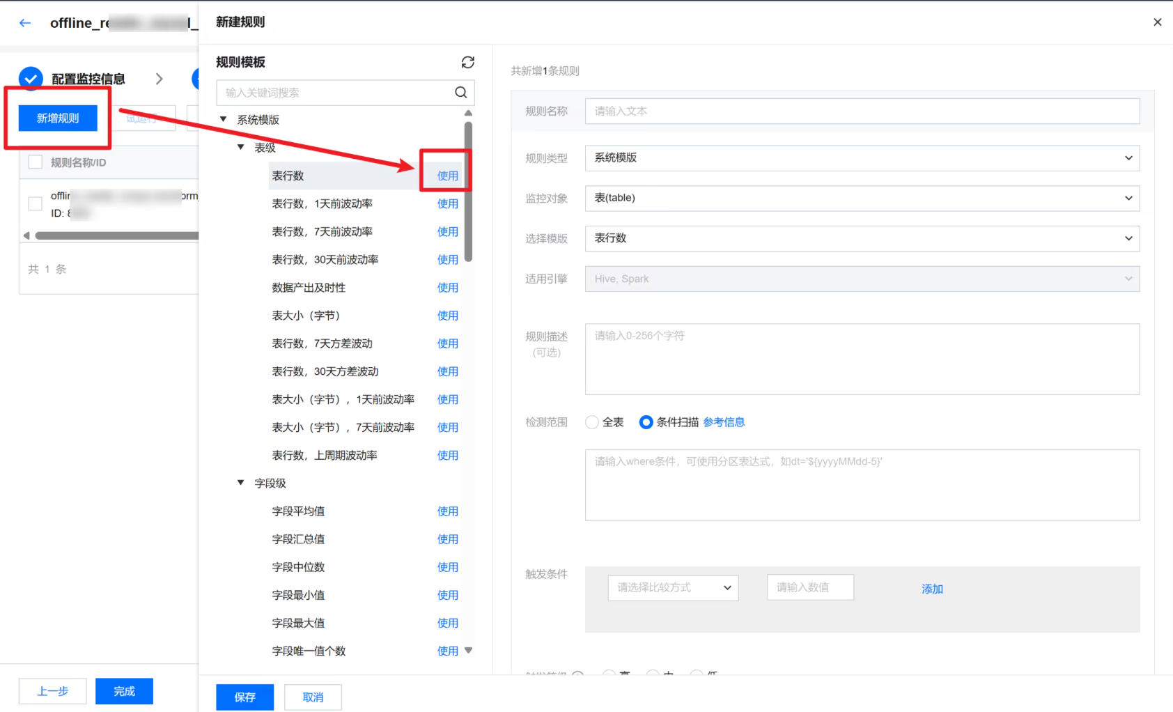 监控对象 | 监控对象可分为:表级和字段级(如果从左侧树状图中选择规则模板,此处将默认展示所选模板参数): 表级,可对表行数,表大小(仅支持 Hive 表)进行监控。 字段级,可对字段是否为空,是否重复,平均值、最大值、最小值等进行监控。 |