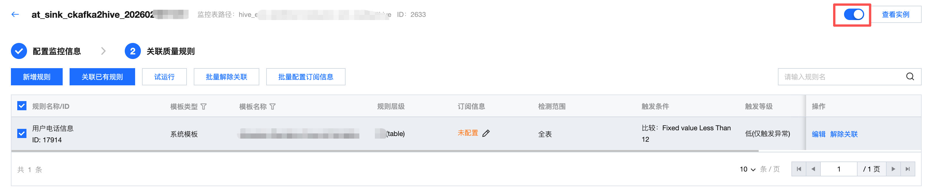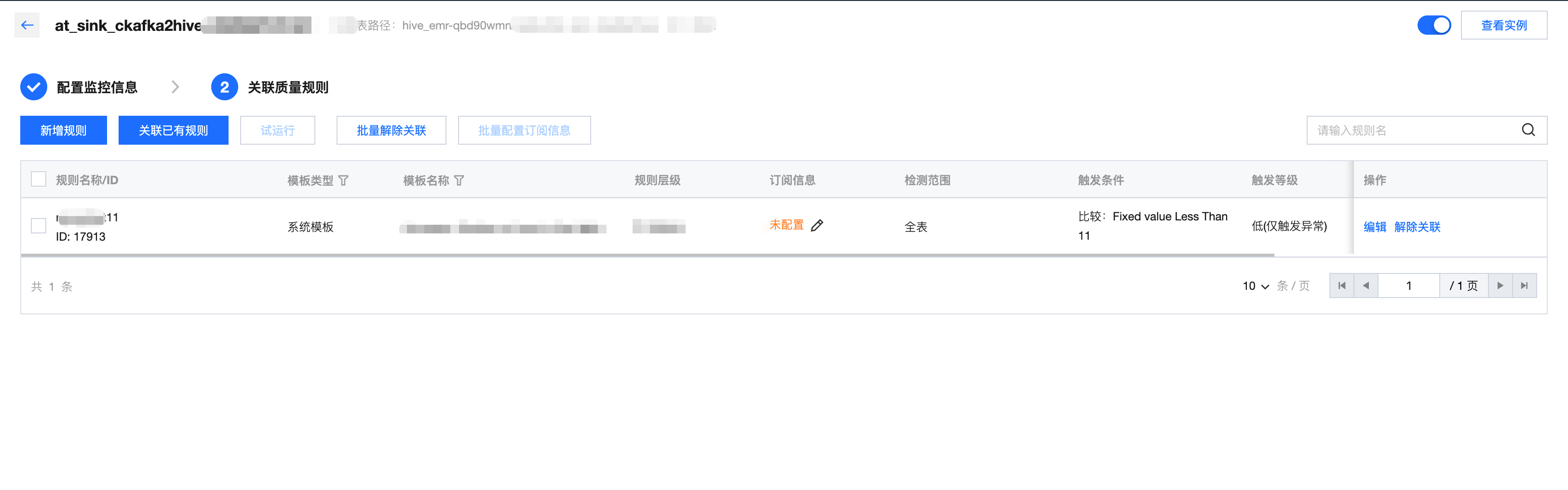关联规则展示在同一张表下,未关联其他监控任务的规则。支持对质量规则进行编辑或关联(可选)。