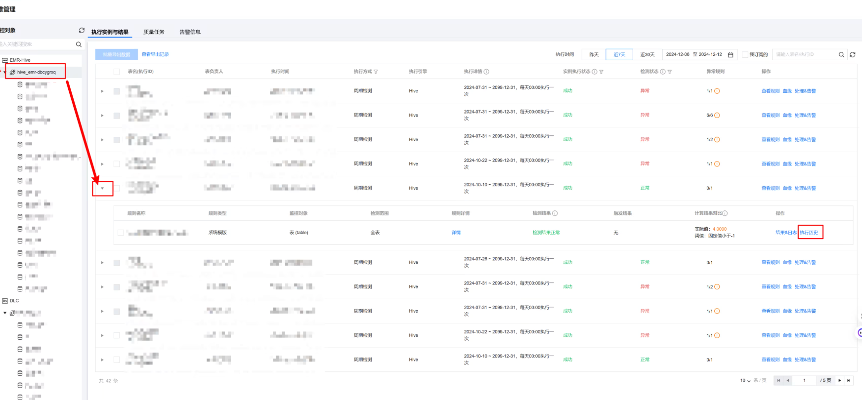 1. 在数据质量 > 运维管理 > 执行实例与结果页面,依次选择数据源、数据库,可查看任务的运行结果。