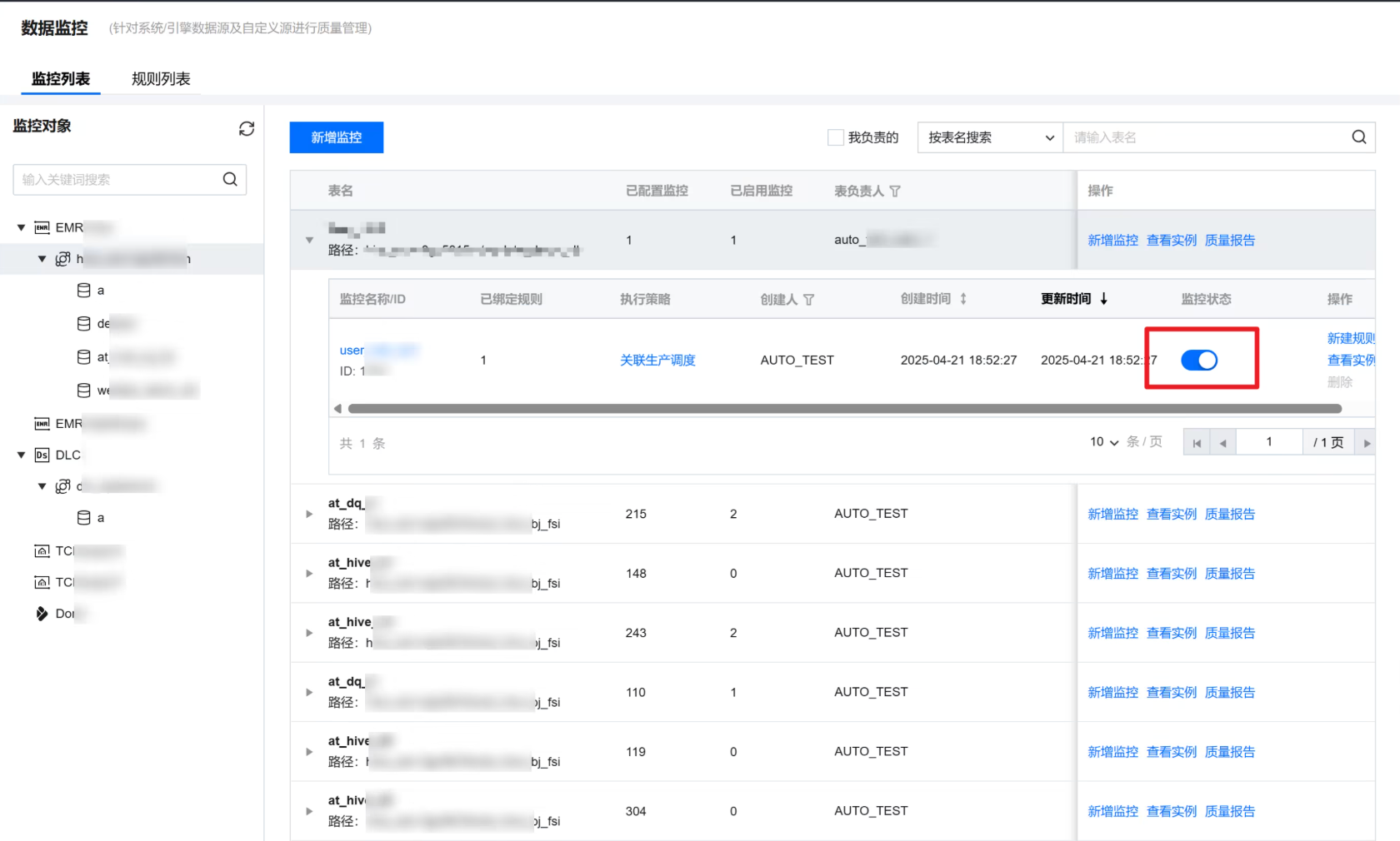 根据监控的试运行结果,可在监控状态列开启或关闭监控(监控在创建后默认开启)。