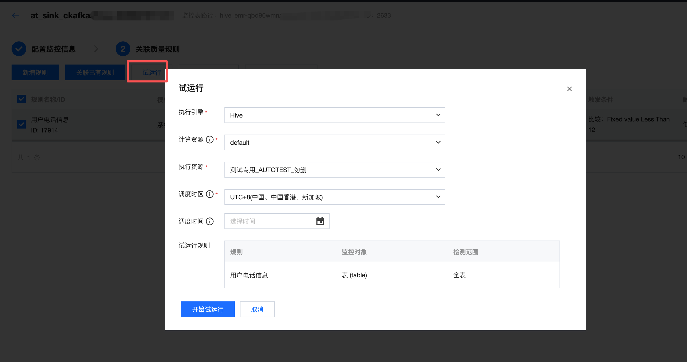 2. 修改调度时间,并单击开始试运行,试运行结束后,您可单击点击查看运行结果。