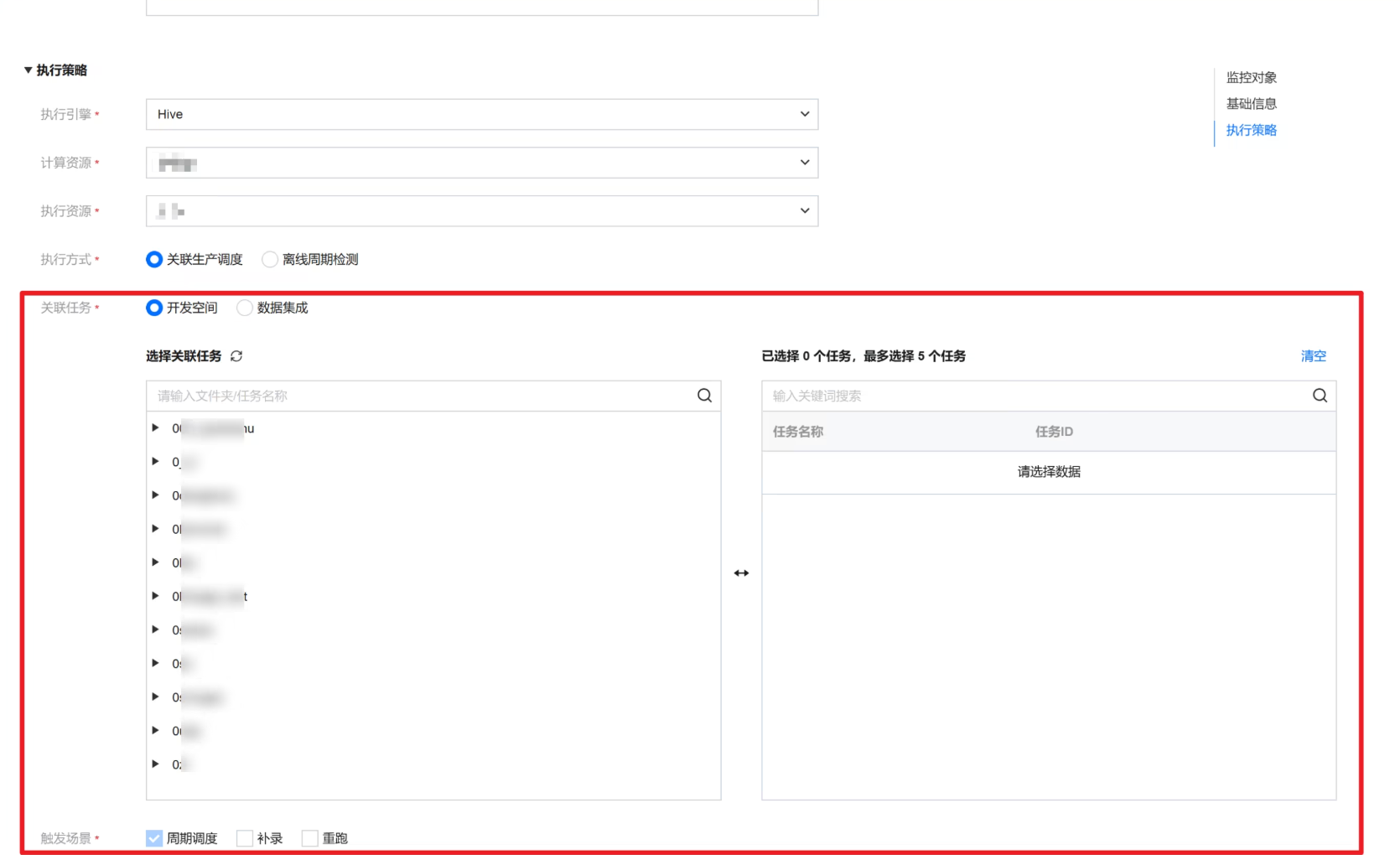 关联任务 | 此处可选择需要关联的生产任务所属的模块,开发空间或数据集成,最多只能关联5个任务: 开发空间:展示开发空间中的目录树结构,支持搜索文件夹或任务名称 数据集成:展示数据集成中的任务列表 |