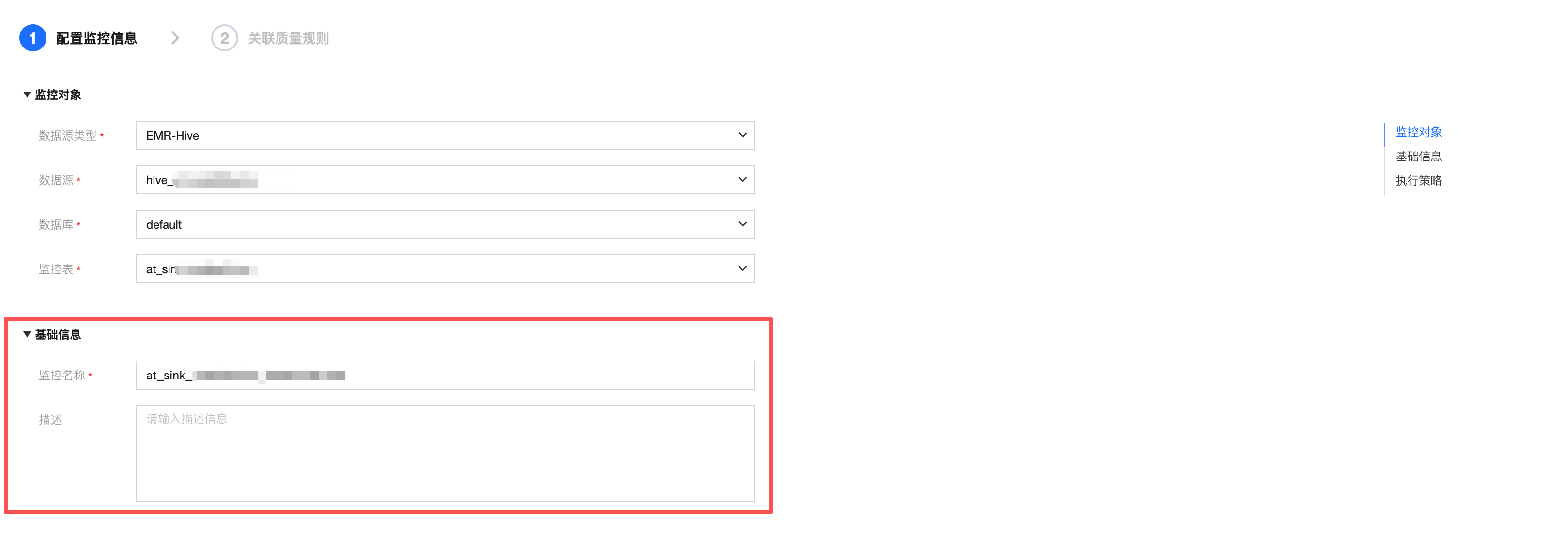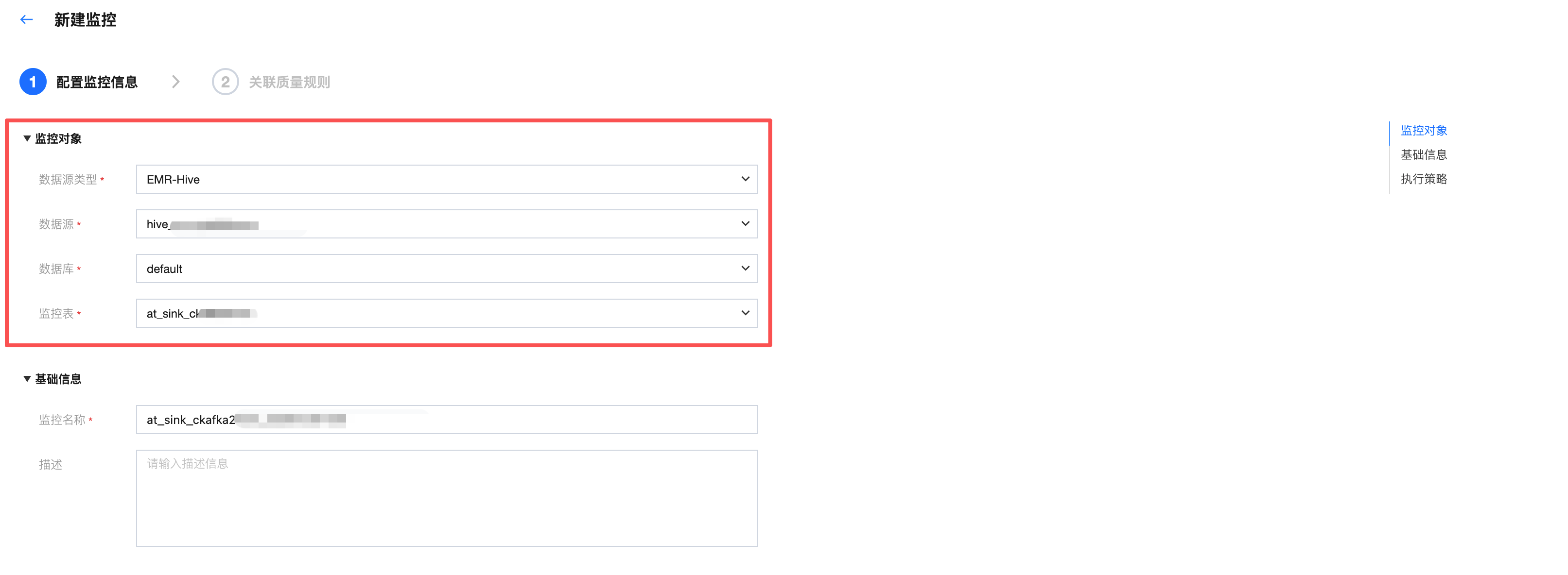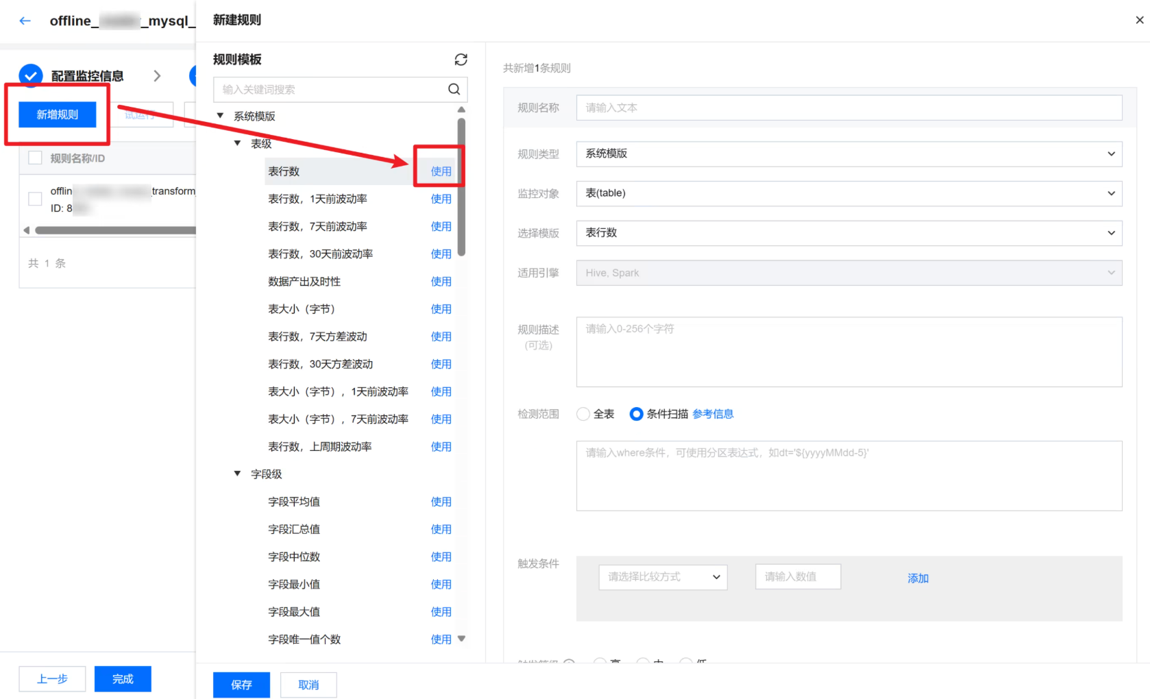 监控对象 | 监控对象可分为:表级和字段级(如果从左侧树状图中选择规则模板,此处将默认展示所选模板参数): 表级,可对表行数,表大小(仅支持 Hive 表)进行监控。 字段级,可对字段是否为空,是否重复,平均值、最大值、最小值等进行监控。 |